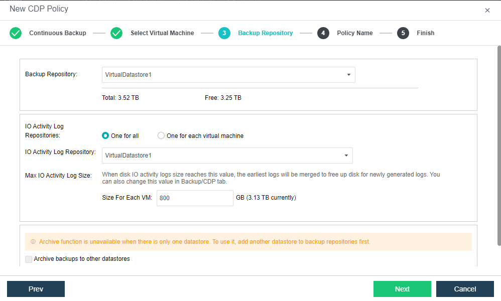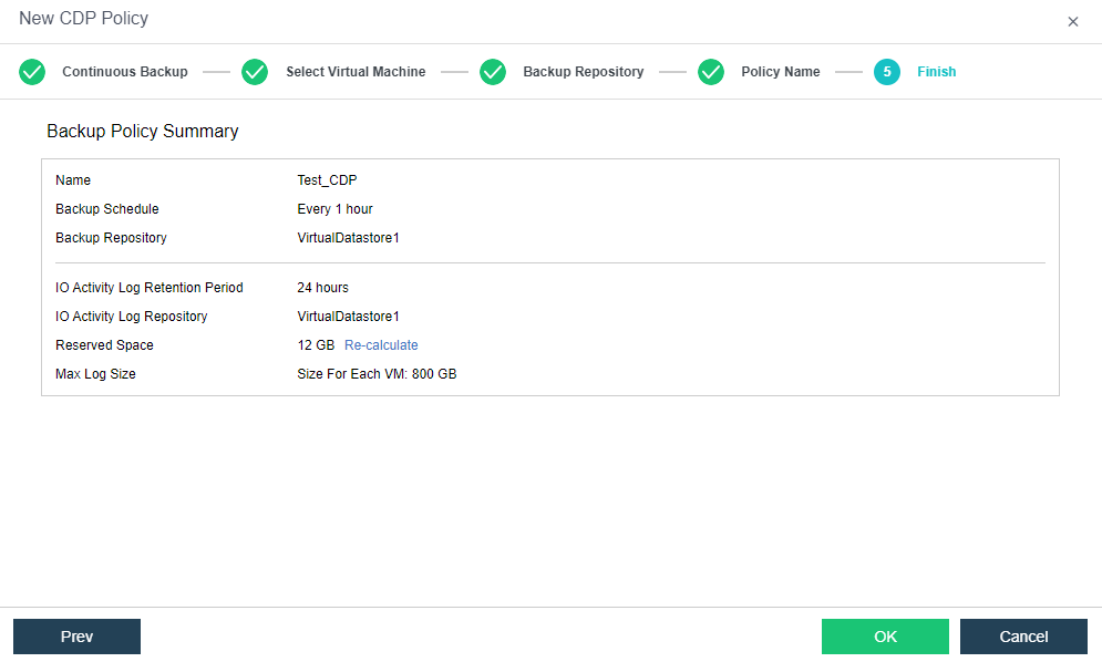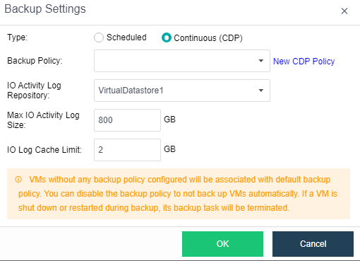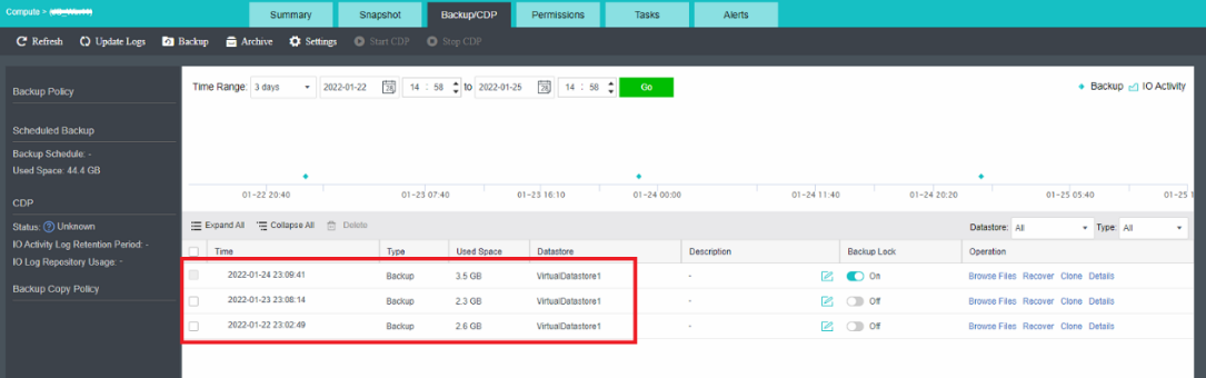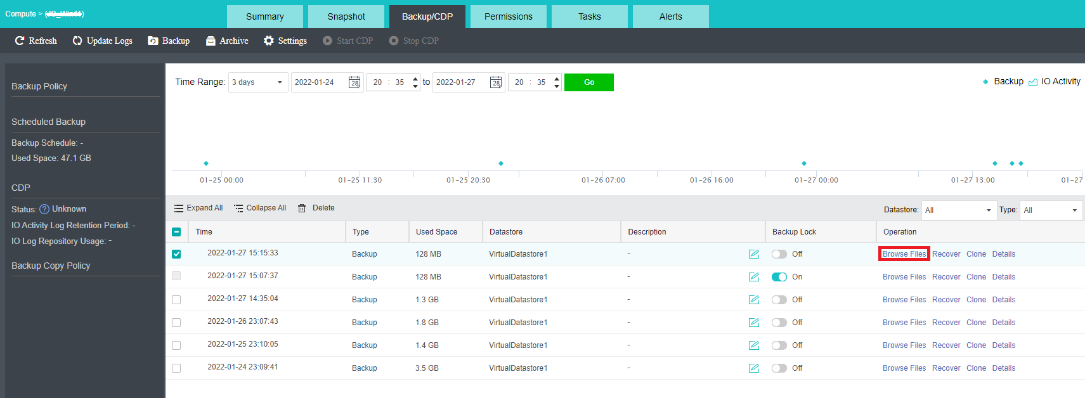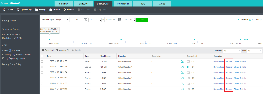 - CDP is continuous data protection. It can record every IO of the business system to the disk in the virtual machine, restore the virtual machine to the state at any time, or directly view and download the file at a particular time. It is of great value for file deletion, viruses, system crashes, data damage, and other faults, so the RPO is close to 0.