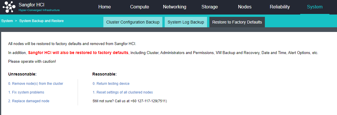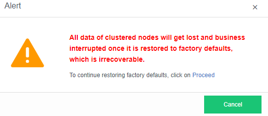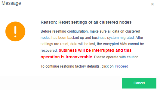 All data in the cluster, including virtual machines, backups, and virtual network devices, will be formatted and restored to the factory state.