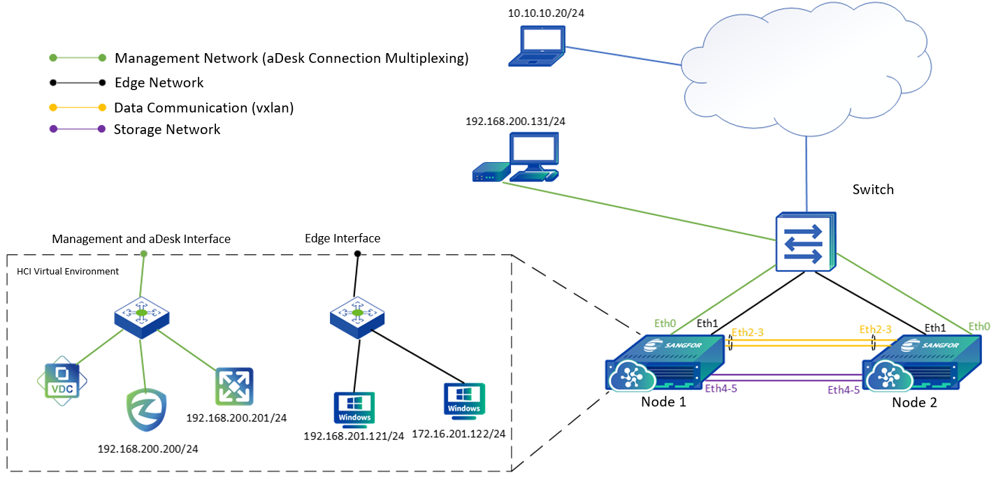 Sangfor HCI is based on HCI architecture, takes virtualization technology as the core, and uses components such as computing virtualization (aSV), storage virtualization (aSAN), network virtualization (aNET), and security virtualization (aSEC) to integrate computing, storage, network, and other virtual resources into a standard x86 server to form a benchmark architecture unit. Moreover, multiple sets of unit devices can be aggregated through the network to realize modular seamless scale-out and form a unified resource pool.