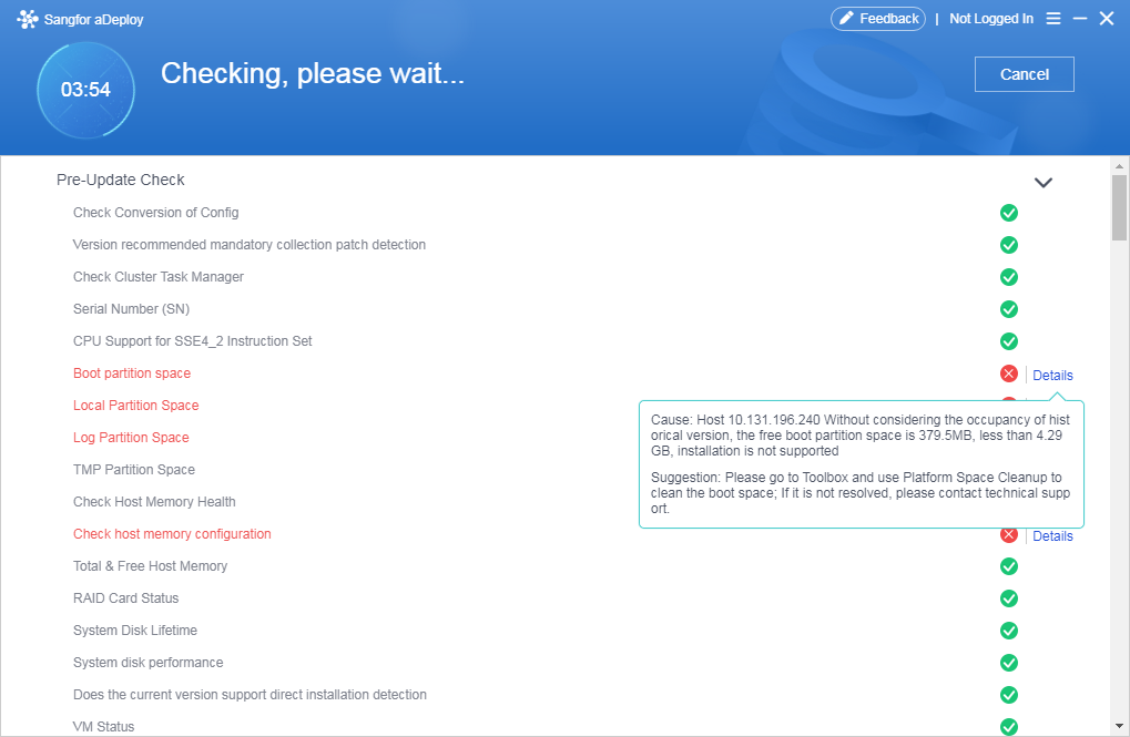 c. If a clustered node fails the pre-upgrade check and the pre-upgrade check does not proceed for more than 10 minutes, please contact a Sangfor technical support representative.
