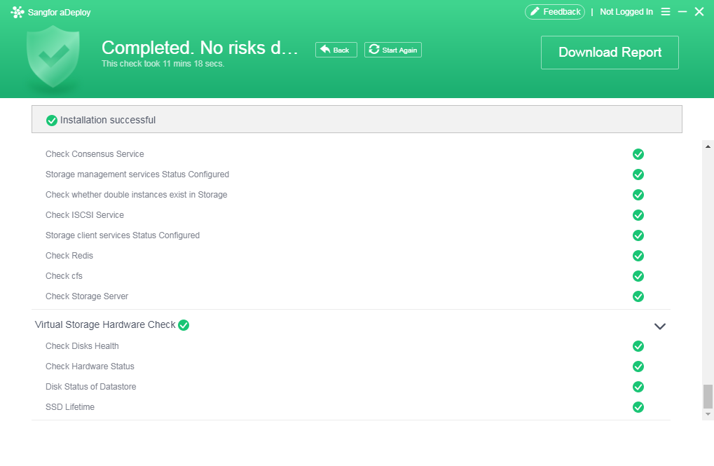Click Health Check on the home page to go to the health check page. In addition to the default entities, select Virtual Storage Data and click Start. After the check is complete, if the score is lower than 100 points, handle the identified problems according to the check results and solutions, and then perform Health Check again. Before upgrading, please confirm that the health check score is 100 points.