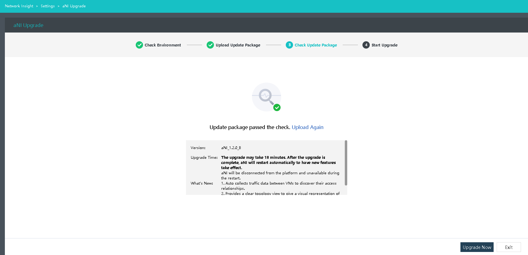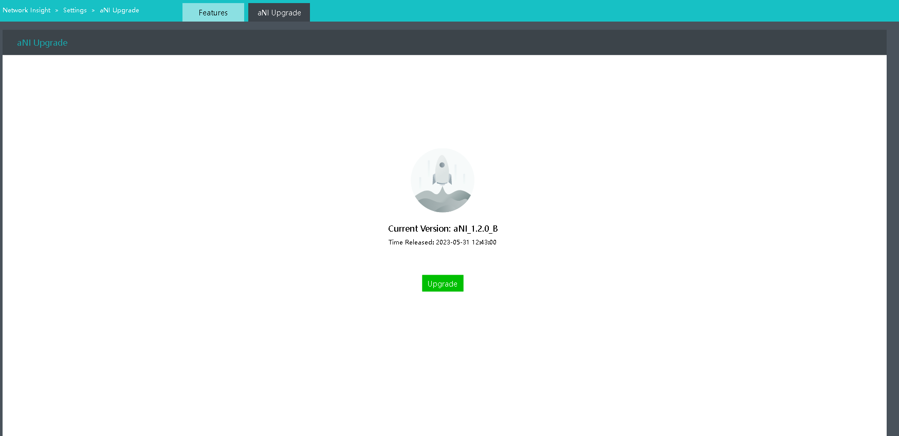 - Go to Networking > Network Insight > Settings > aNI Upgrade and click Upgrade.