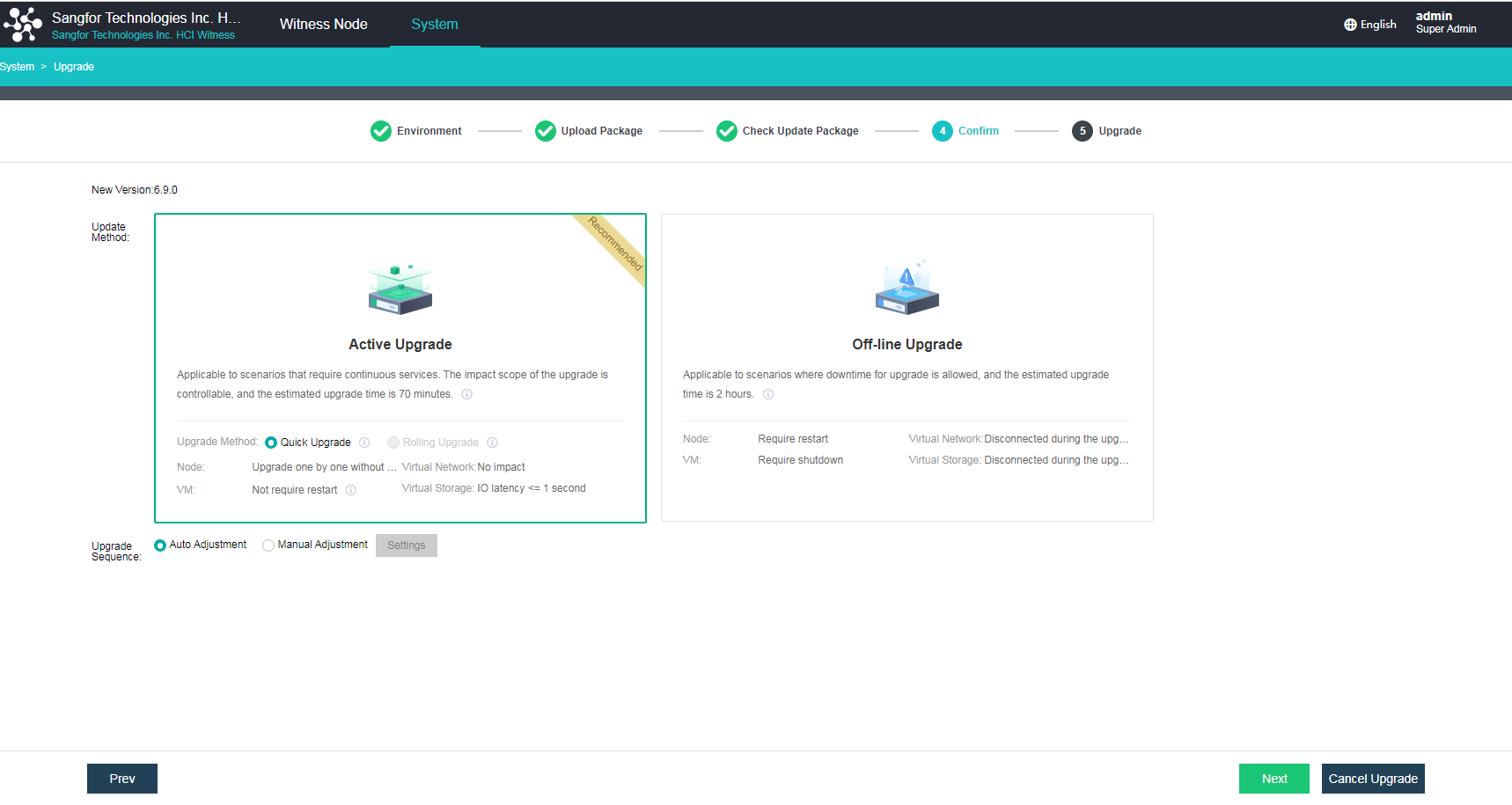 | Offline Upgrade/Active Upgrade | Check Environment for Upgrade | The environment check failed. | Troubleshoot and try again. If the problem persists, please contact a Sangfor technical support representative. | Yes, exit the upgrade to roll back to the original version. |