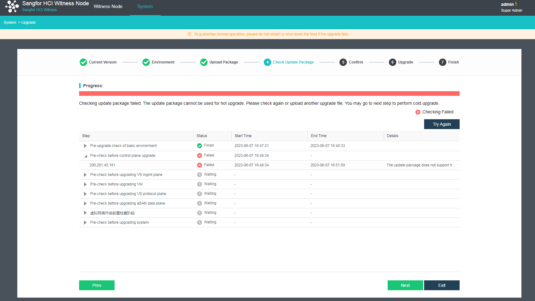 b. If the pre-upgrade check fails and a message indicates the pre-upgrade check failure, please contact a Sangfor technical support representative.