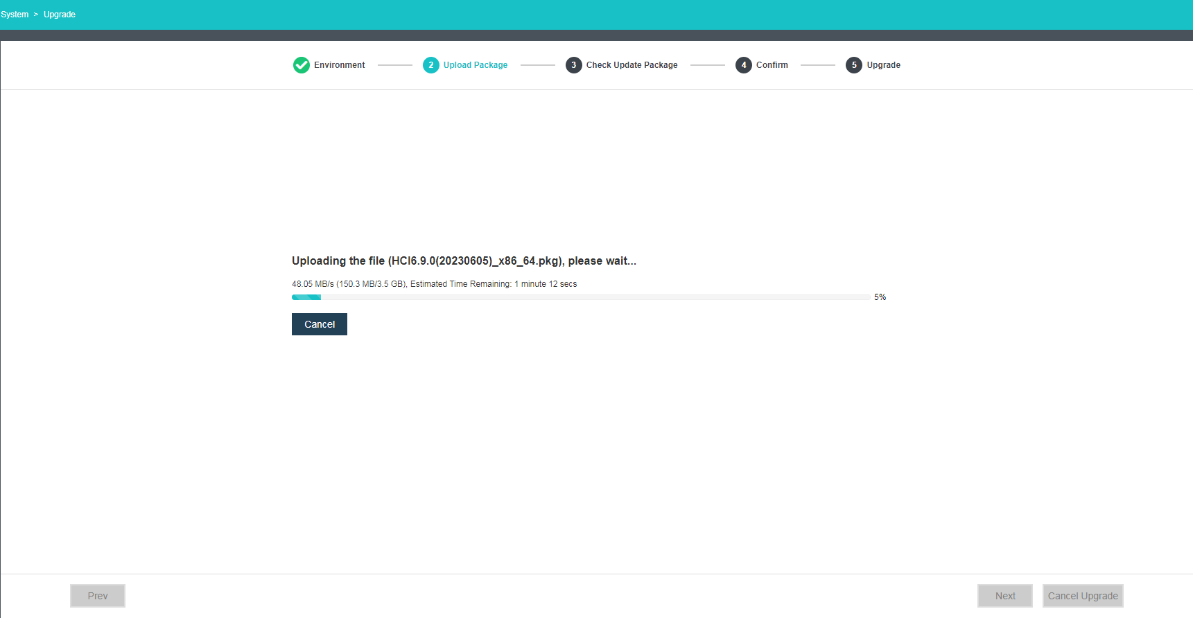 - After the environment passes the check, upload the HCI update package.