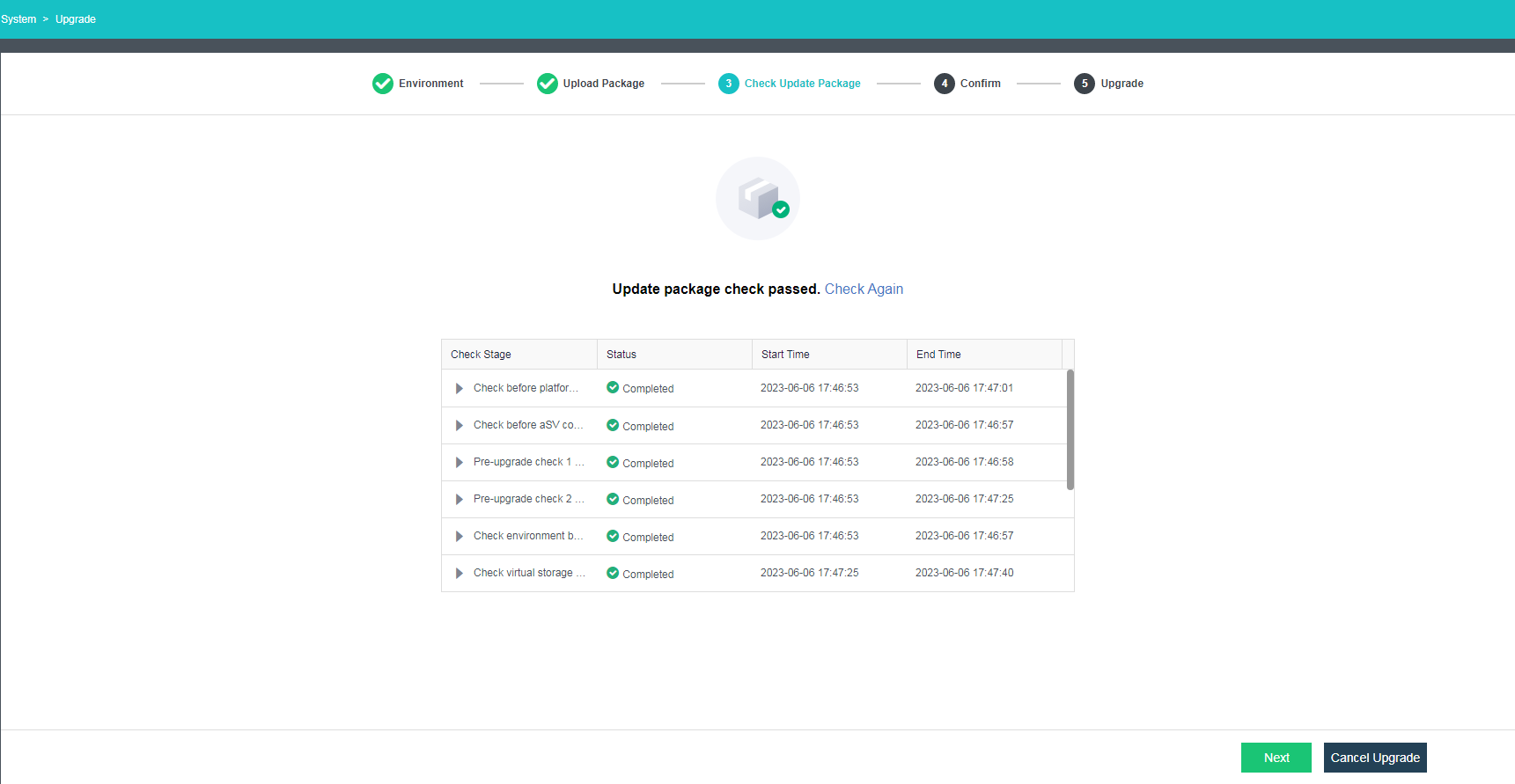 Check the update package. (If the current version does not support the active upgrade using the update package, click Next to perform an offline upgrade. If the active upgrade is supported, please wait until all checking steps are finished before the upgrade. If any step fails, fix the issues first.)