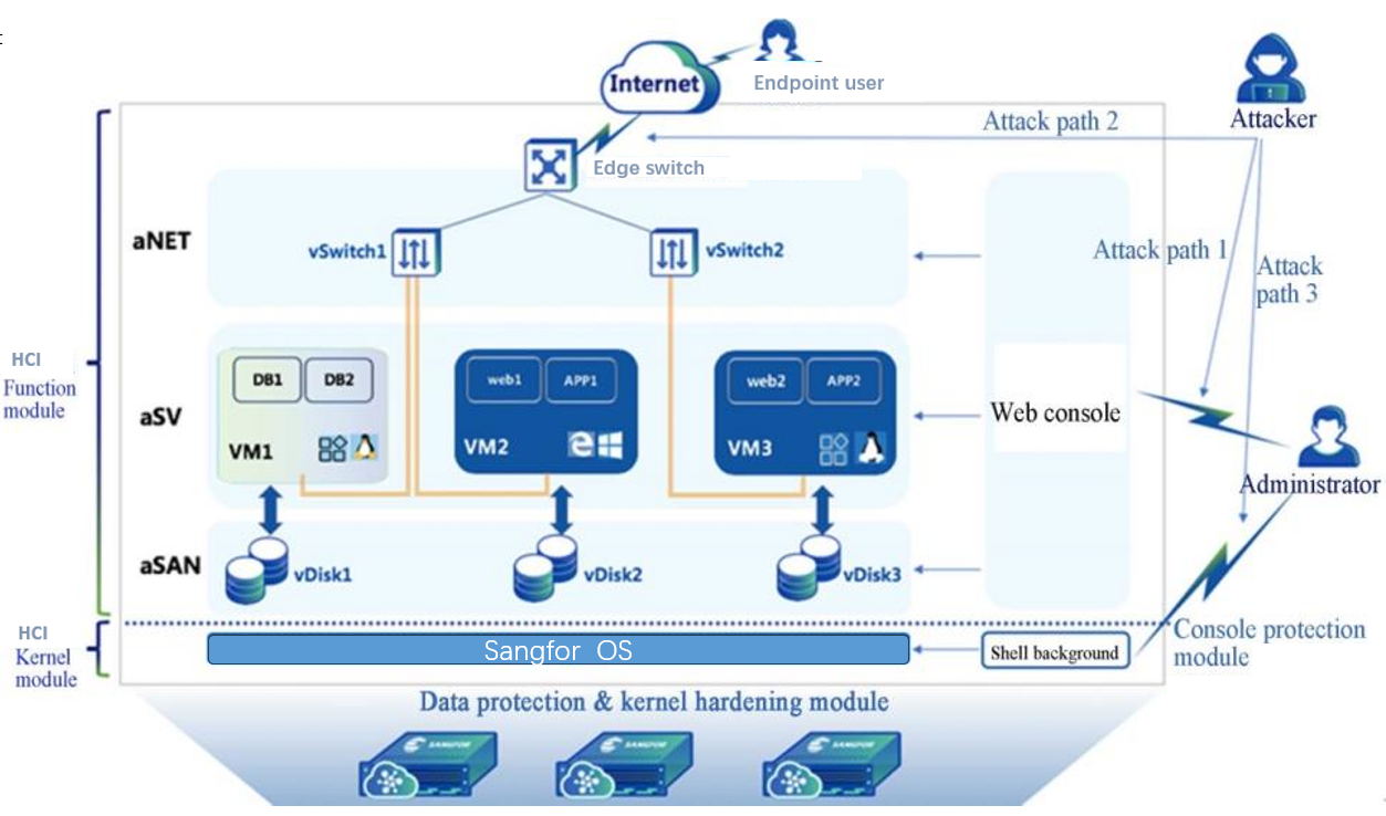 Protection against attack path 2: The HCI platform provides comprehensive security modules at the service layer, including virtual switch isolation mechanisms, distributed firewalls, NFV components, Endpoint Secure antivirus, and aSecurity.