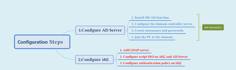 The configuration steps are as shown in the figure below. It should be noted that to make everyone familiar with the AD domain faster, we added the AD domain configuration method, which is the part marked as not necessary. You may focus on configuring IAG if the AD domain has been deployed.