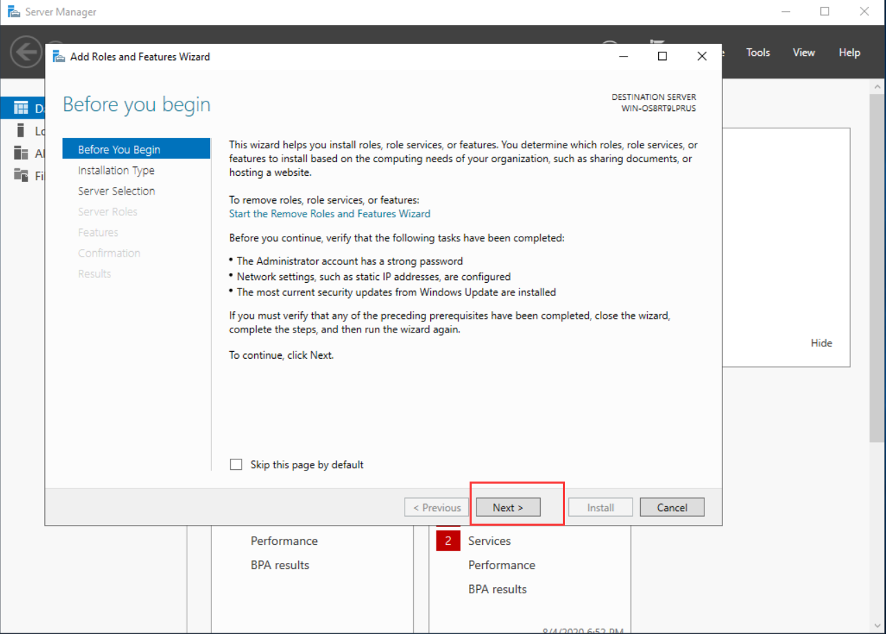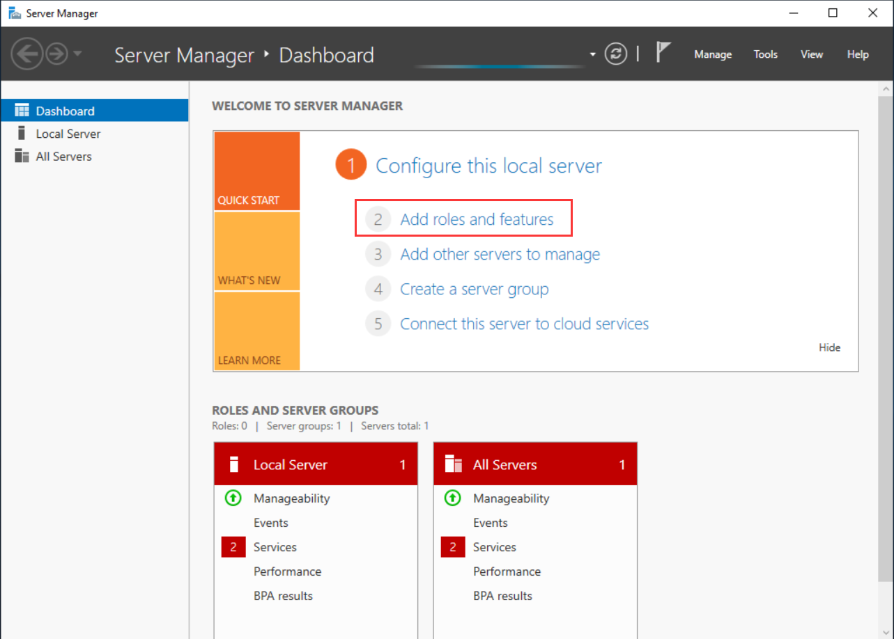 - On the Dashboard, click Add roles and features to open the Add Roles and Features Wizard.