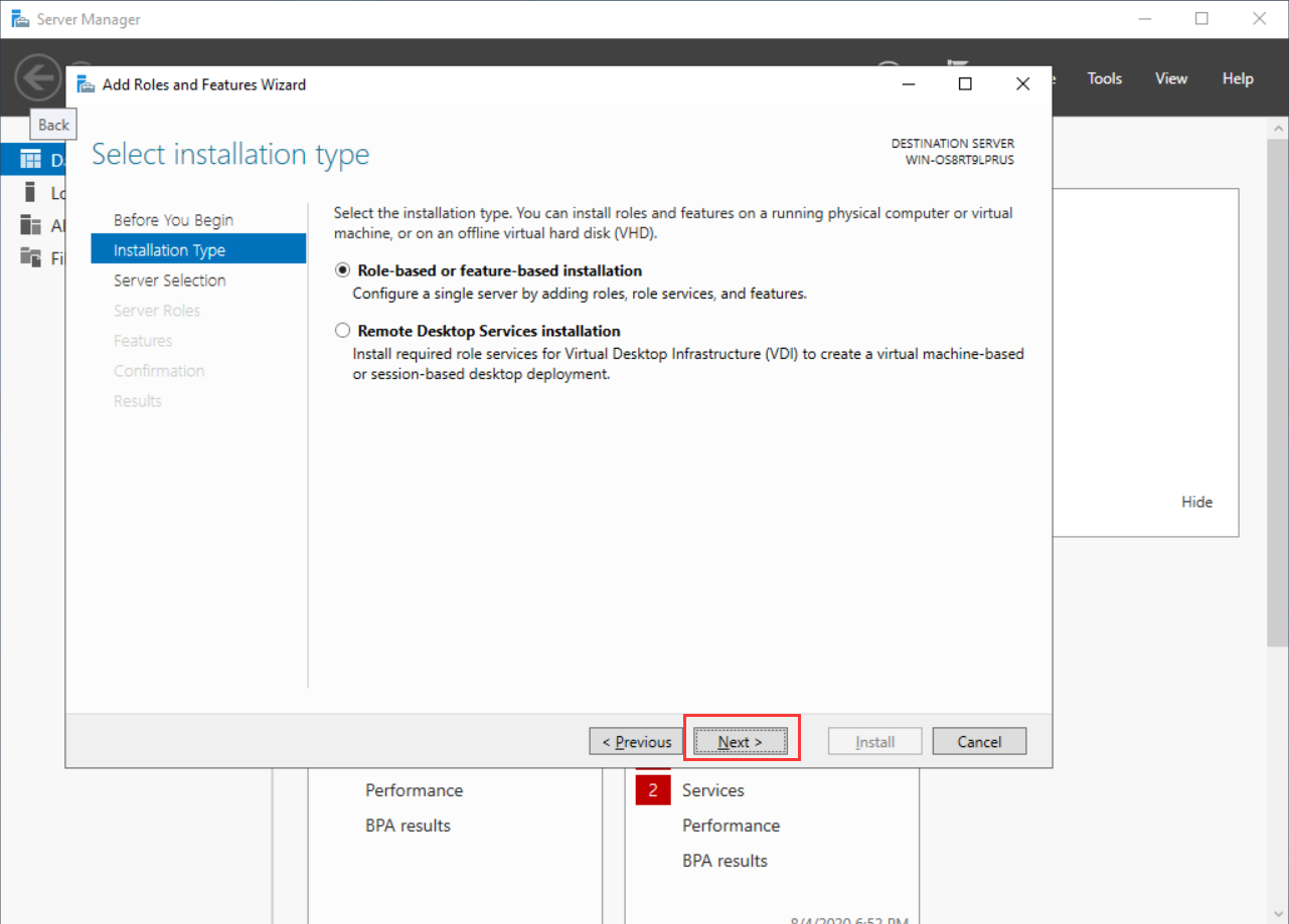 - On the Installation Type tab, select Role-based or feature-based installation. Then click Next.