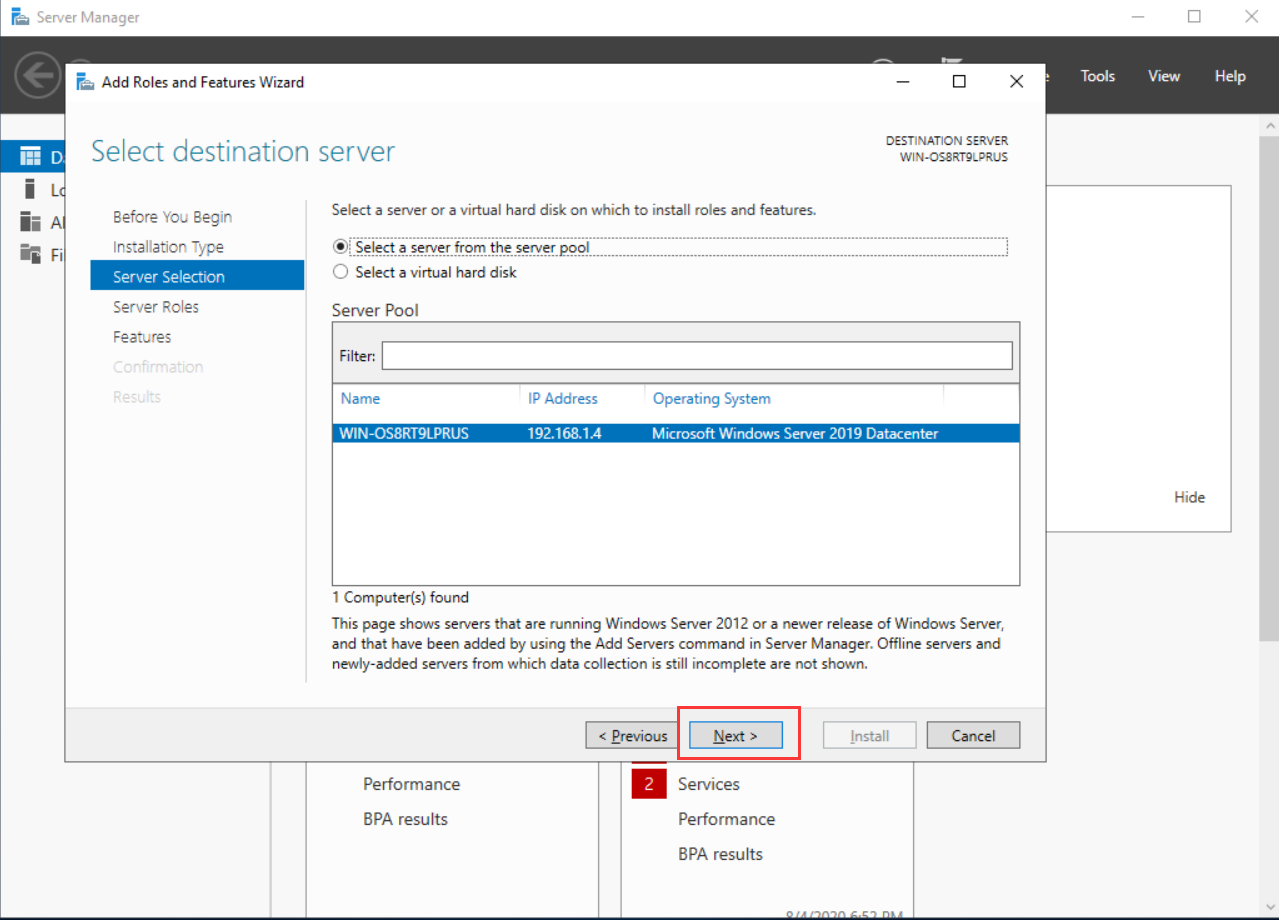 - On the Server Selection tab, choose Select a server from the server pool, and then click Next.