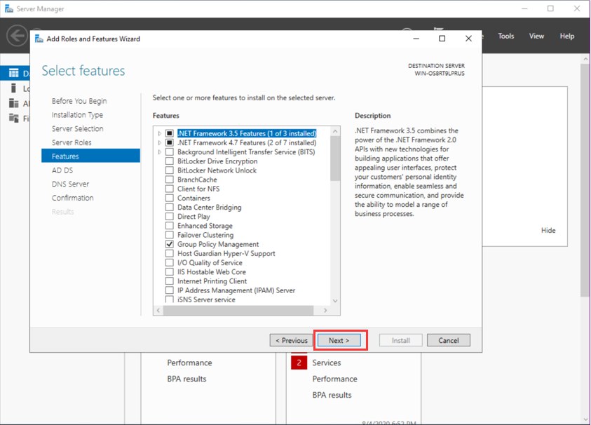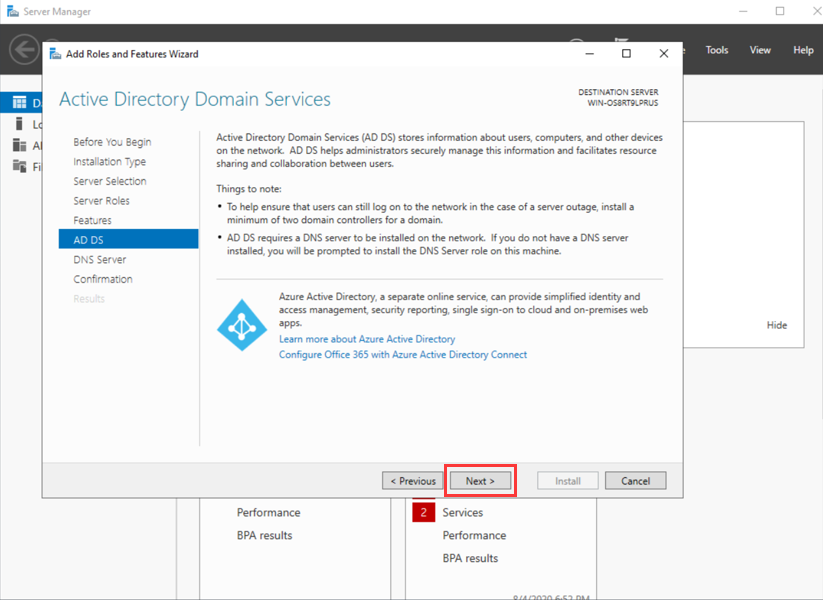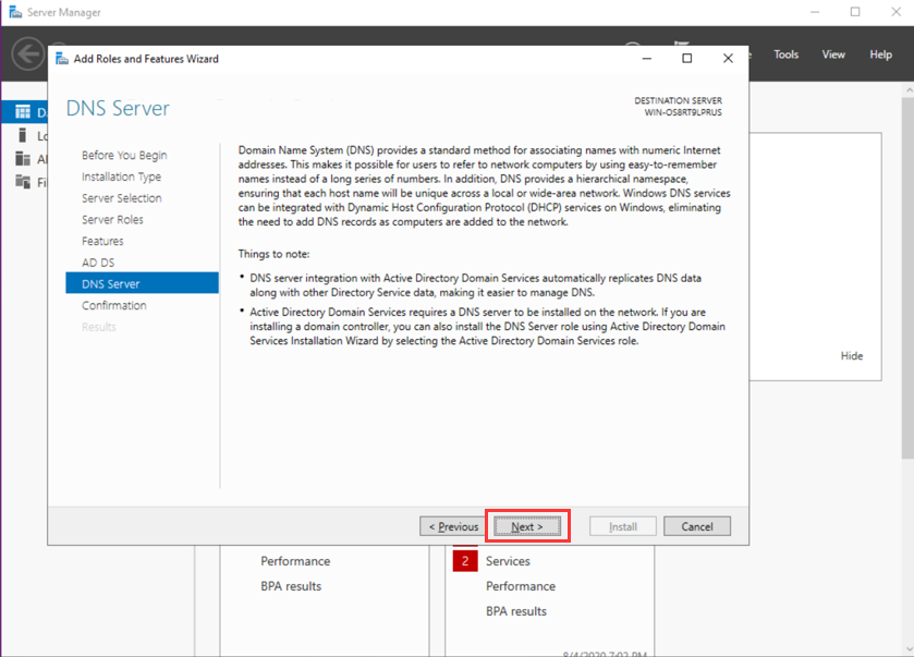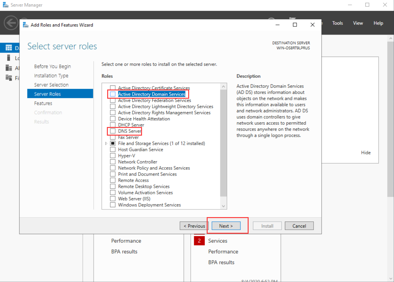 - On the Server Roles tab, select the functions that need to be installed, such as Active Directory Domain Services and DNS Server, then click Next.