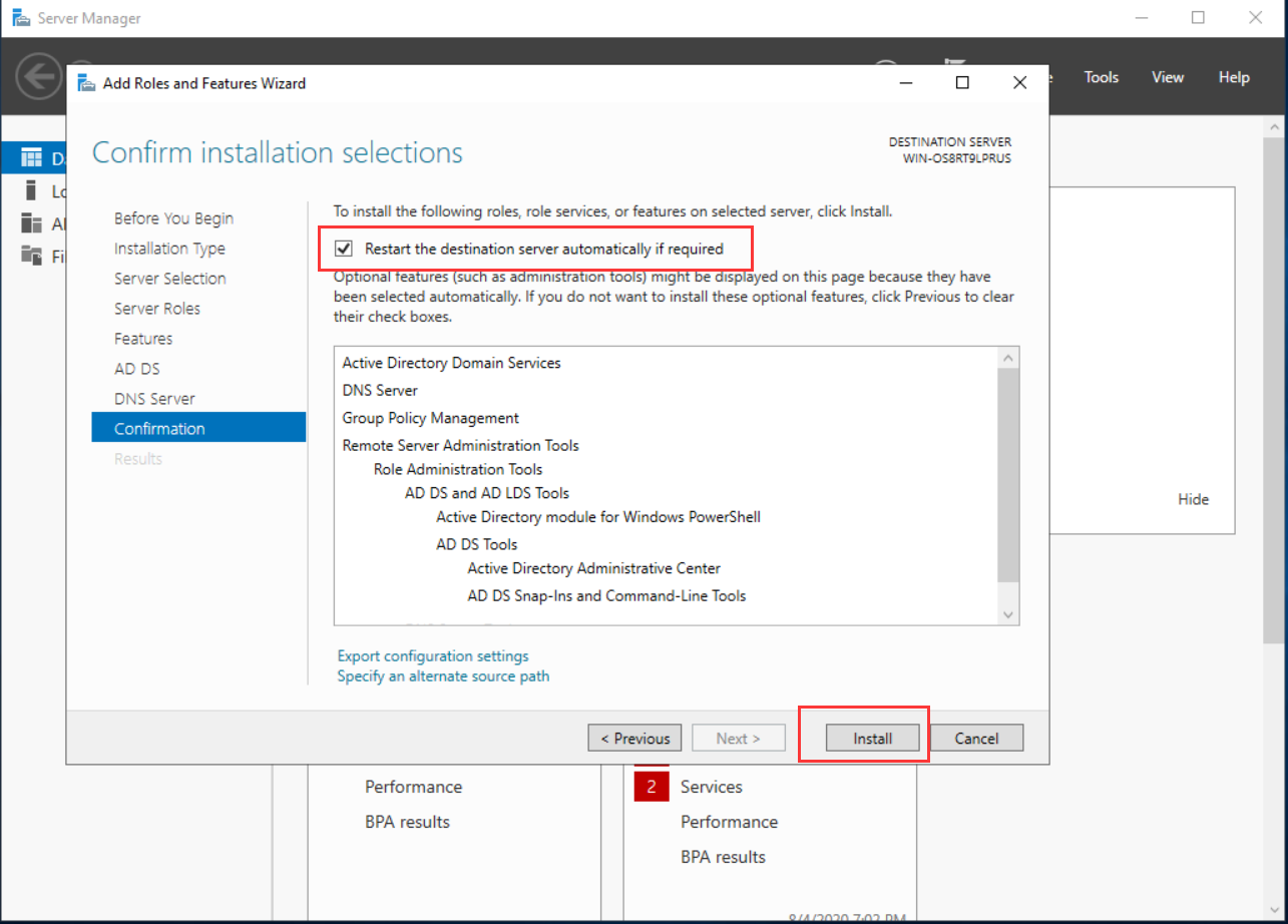 - On the Confirmation tab, check the Restart the destination server automatically if required checkbox. Then, click Install.