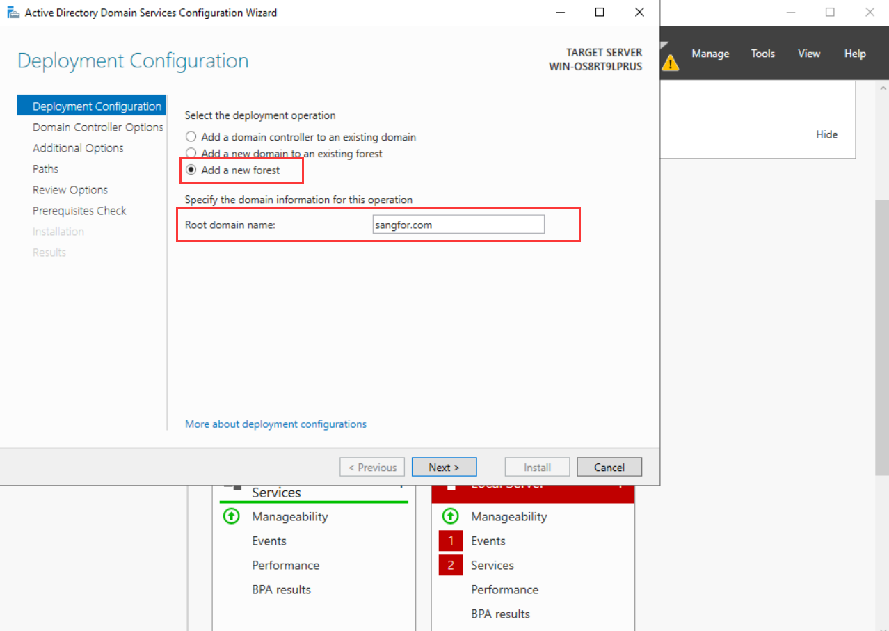 - After entering the Active Directory Domain Services Configuration Wizard, on the Deployment Configuration tab, select Add a new forest and specify the Root domain name for the AD domain, such as sangfor.com.