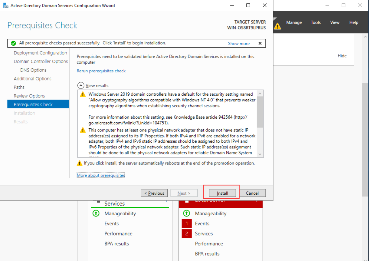 - On the Prerequisites Check tab, click Install to begin the installation.