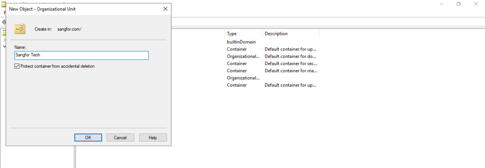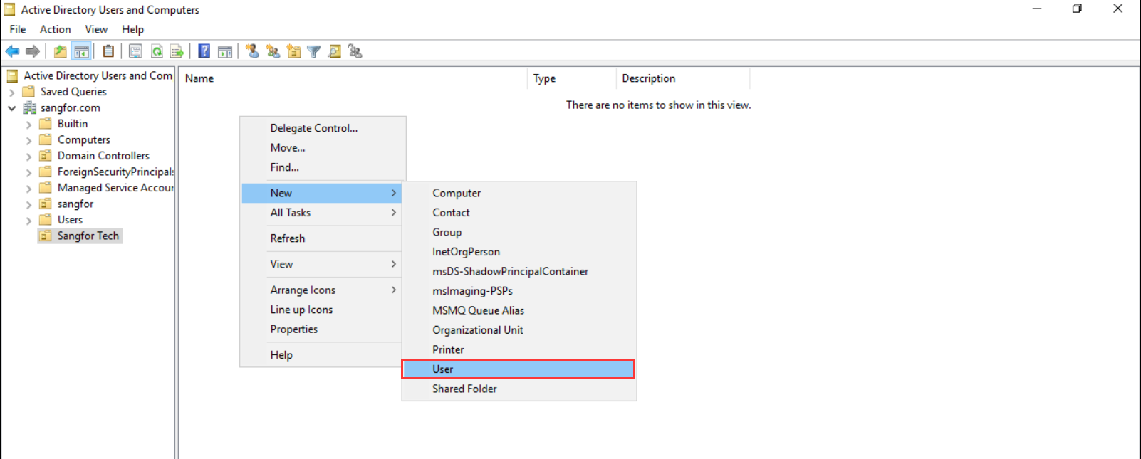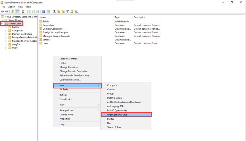 - To facilitate the management of users according to the company’s organizational structure, navigate to the domain name sangfor.com and expand it. Right-click and select New > Organizational Unit to create a logical container to represent a department. For example, create a department named Sangfor Tech.