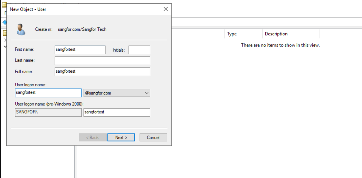 - Right-click the container, and select New > User to create a user in the container, for example, sangfortest.