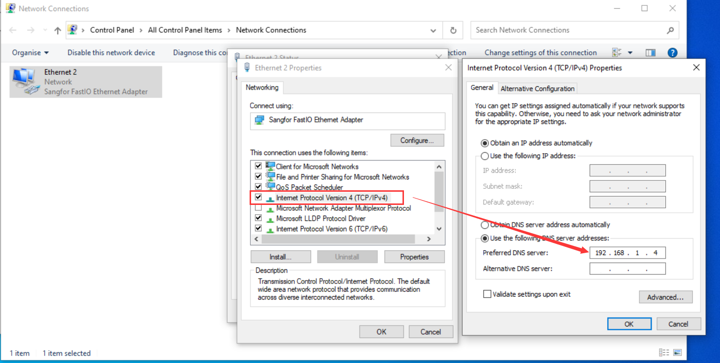 - Configure the PC’s network card, and set the DNS to the IP address of the domain control server: 192.168.1.4.