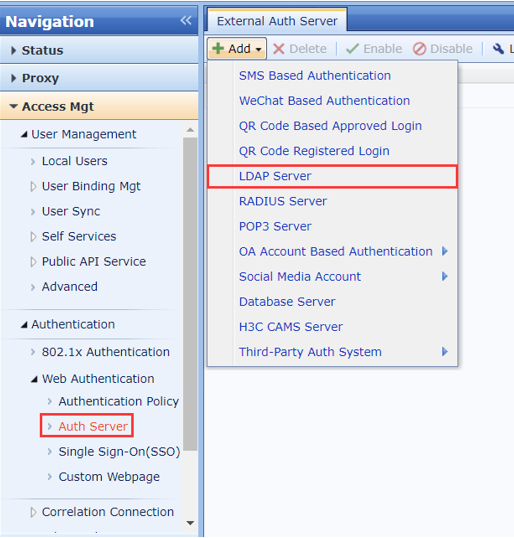 - On the IAG web console, navigate to Access Mgt > Authentication > Web Authentication > Auth Server. Click Add > LDAP Server to add a Microsoft AD server on IAG.