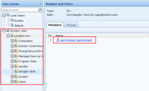 - If IAG and AD server can interact normally, navigate to Access Mgt > User Management > Local Users. You can see that IAG has obtained the domain user information of the AD server, including the user sangfortest we created earlier.