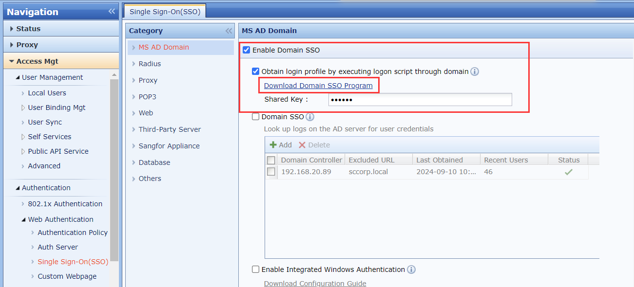 - On the IAG web console, navigate to Access Mgt > Authentication > Web Authentication > Single Sign-On(SSO) > MS AD Domain. Select Enable Domain SSO and Obtain login profile by executing logon script through domain to turn on script SSO. Here you need to configure a secret Shared Key for authentication, for example, 123456.