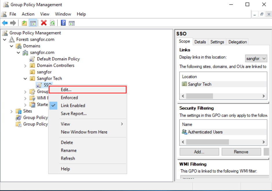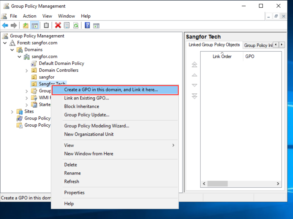 - Right-click the newly created Sangfor Tech container, select Create a GPO in this domain, and Link it here… to create a Group Policy Object (GPO).