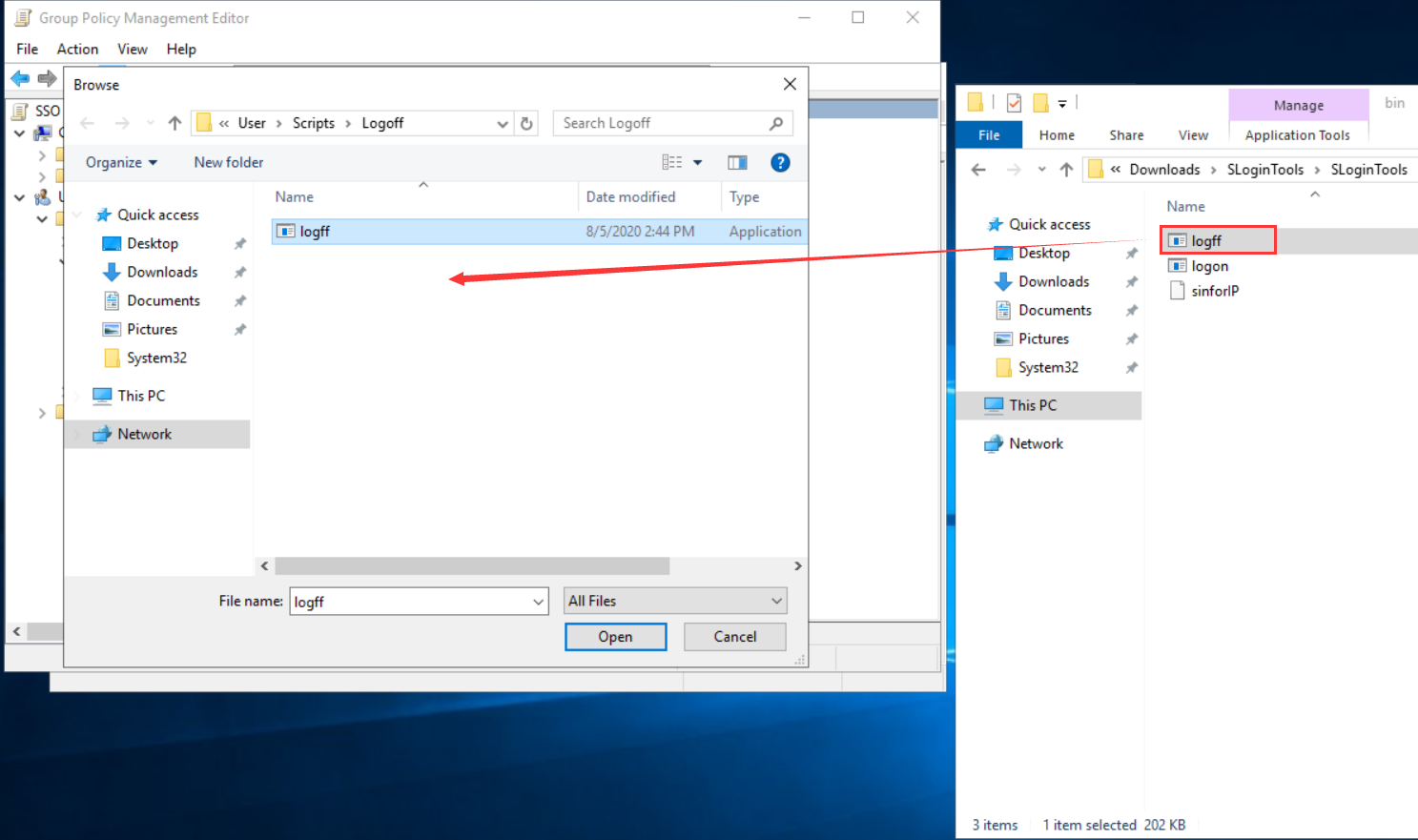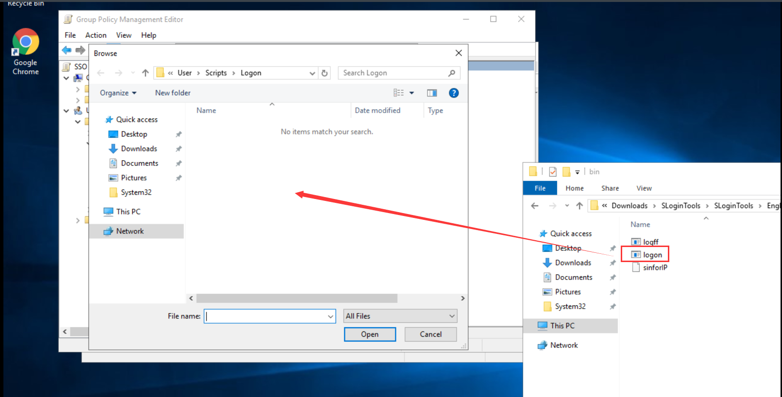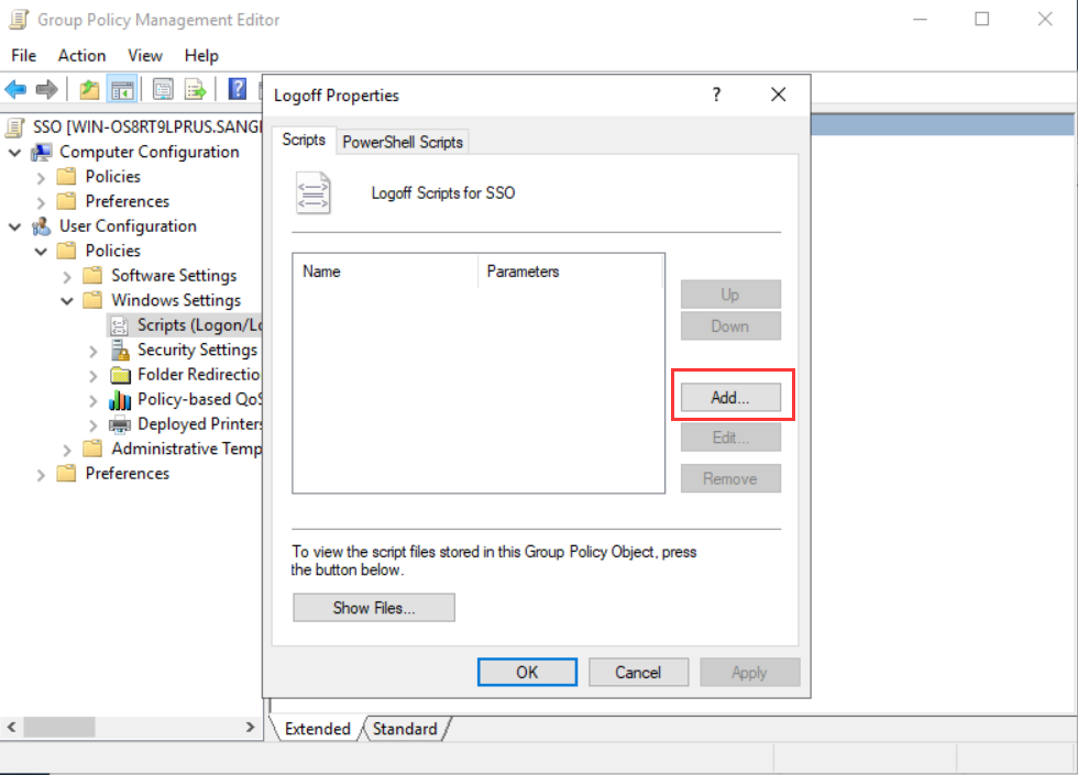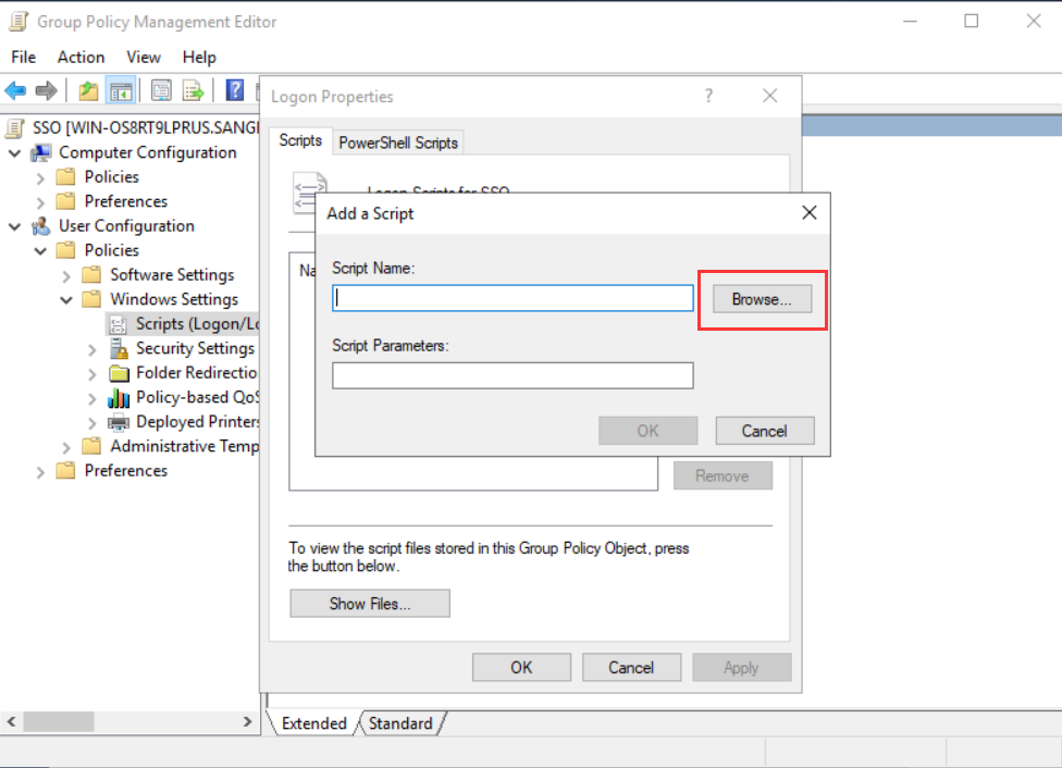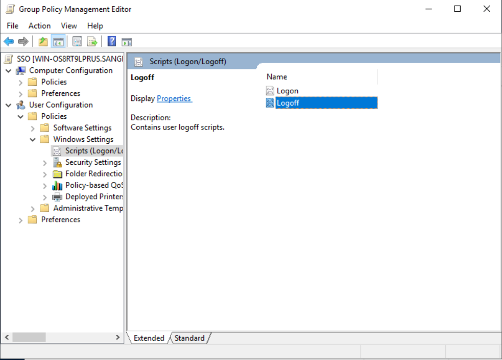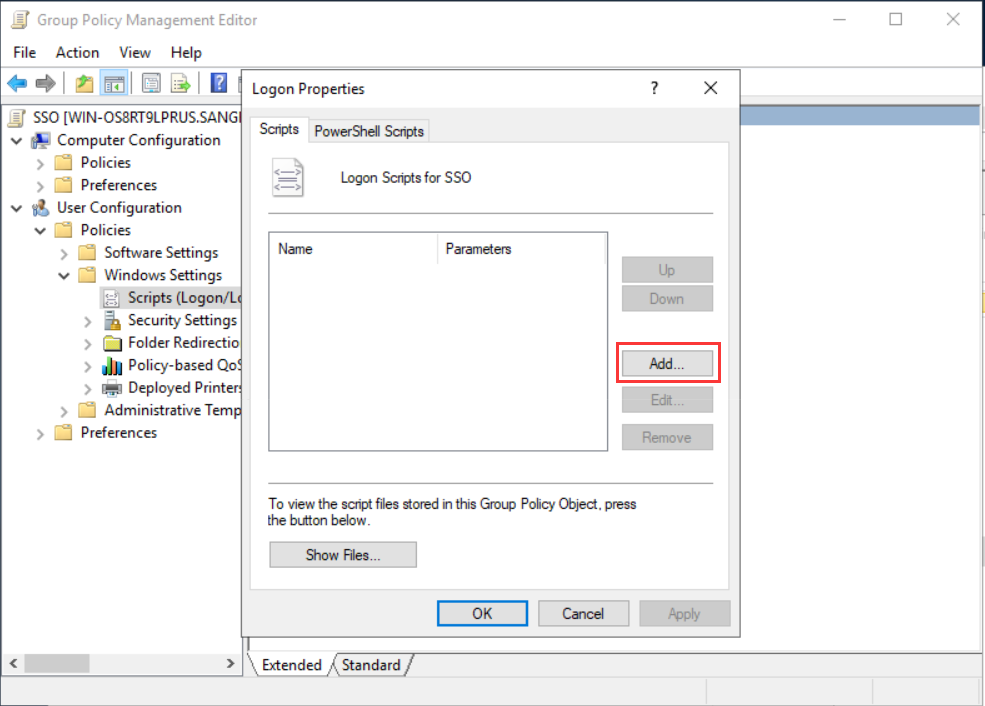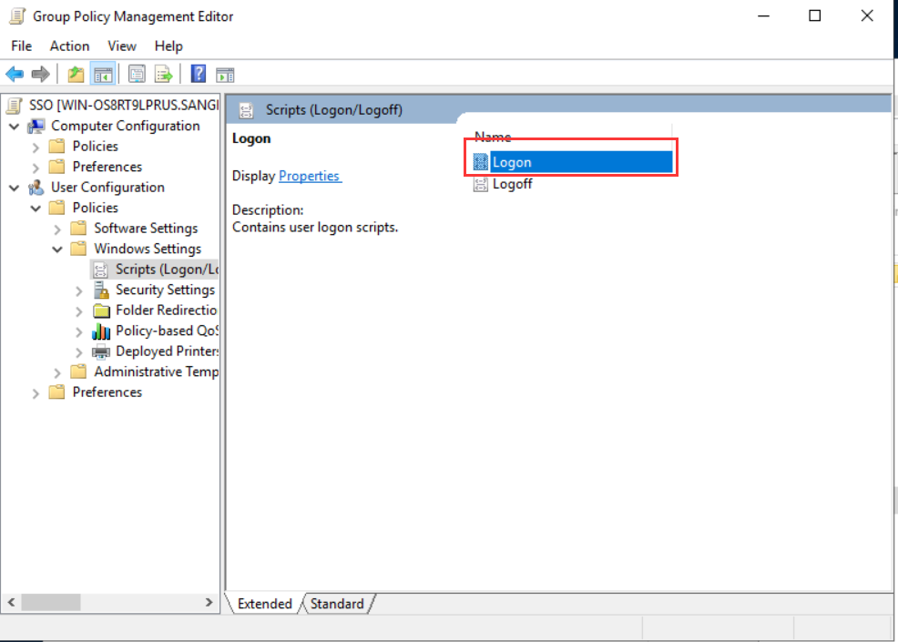 - On the Group Policy Management Editor, navigate to User Configuration > Policies > Windows Settings > Scripts (Logon/Logoff), and select the Logon script.