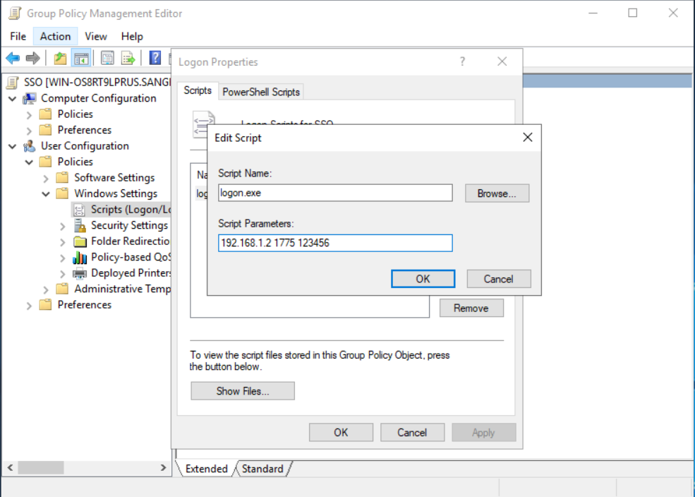 - In the Edit Script dialog box, set the Script SSO parameters. Specify the IAG IP address 192.168.1.2 and the UDP port number 1775, which is used to accept the authentication information actively transmitted by the PC. Then, fill in the secret shared key 123456 that we configured on the IAG web console.