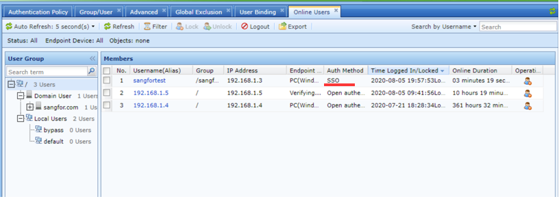 - Restart the user’s PC and log in to the PC with a domain account. You can see that the user is online in IAG and the authentication method is SSO on the Status > Users > Online Users list.