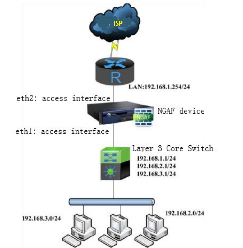NGAF deploy in bridge mode belongs to a Layer 2 network device. Therefore, it can implement all the security functions of the firewall, such as Access control, bandwidth management, DNS mapping, etc. (except for the functions of the route interface).
