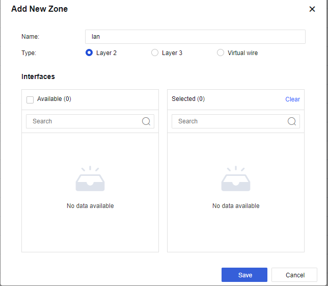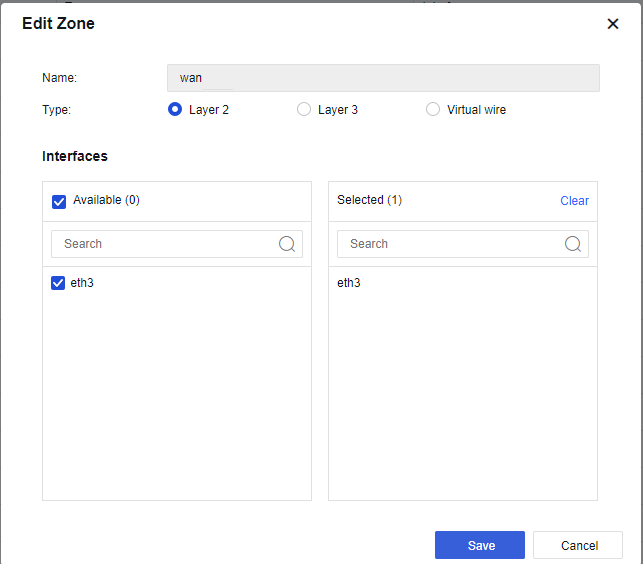 - Navigate to Network > Zone > Add, add LAN, WAN, and Management zone as the figure below:
