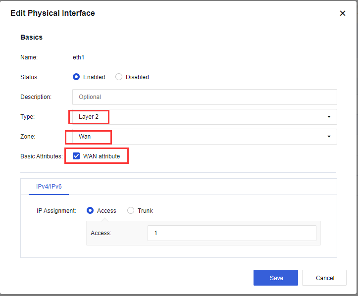 - Navigate to Network > Interfaces > Physical Interface, select the interface and configure the WAN interface as shown in the figure below: