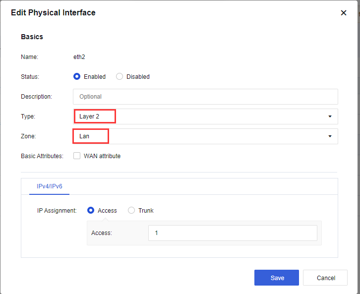 - Navigate to Network > Interfaces > Physical Interface, select the interface and configure as LAN interface as shown in the figure below: