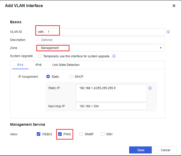 - Navigate to Network > Interfaces > VLAN interface > Add, add a VLAN interface as shown in the figure below: