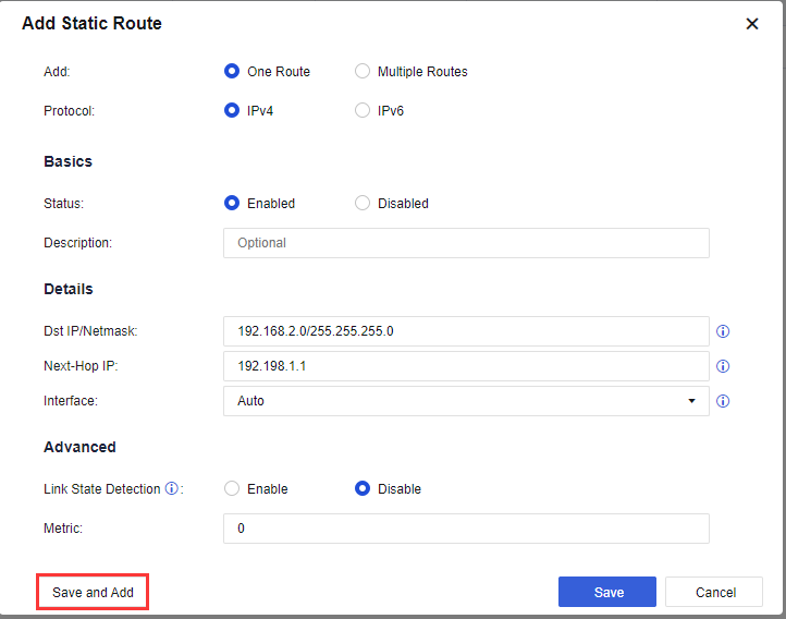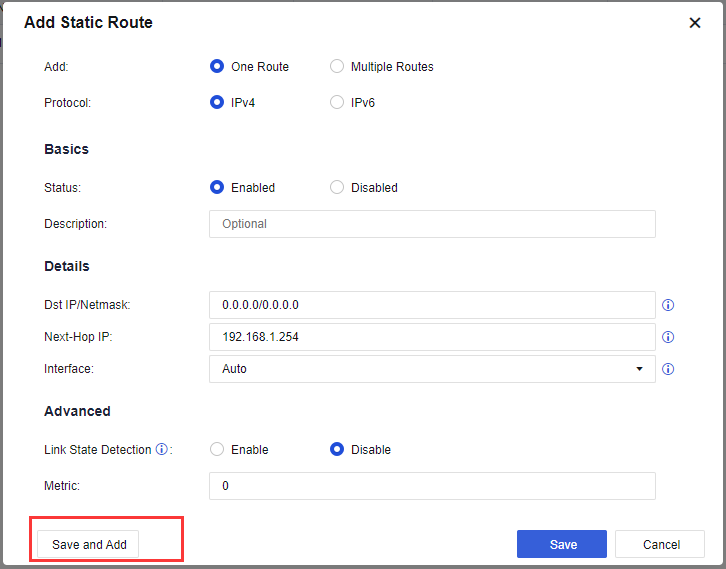 - Navigate to Network > Routes > Static Route > Add to add a default route as shown in the figure below: