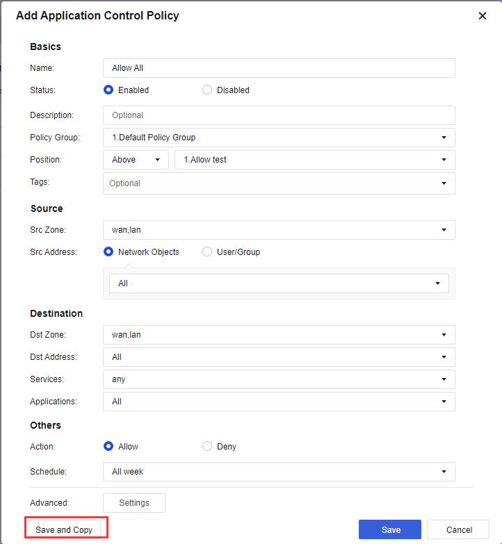 - Navigate to Policies > Application Control > Policies > Add, add an Allow All policy as shown in the figure below: