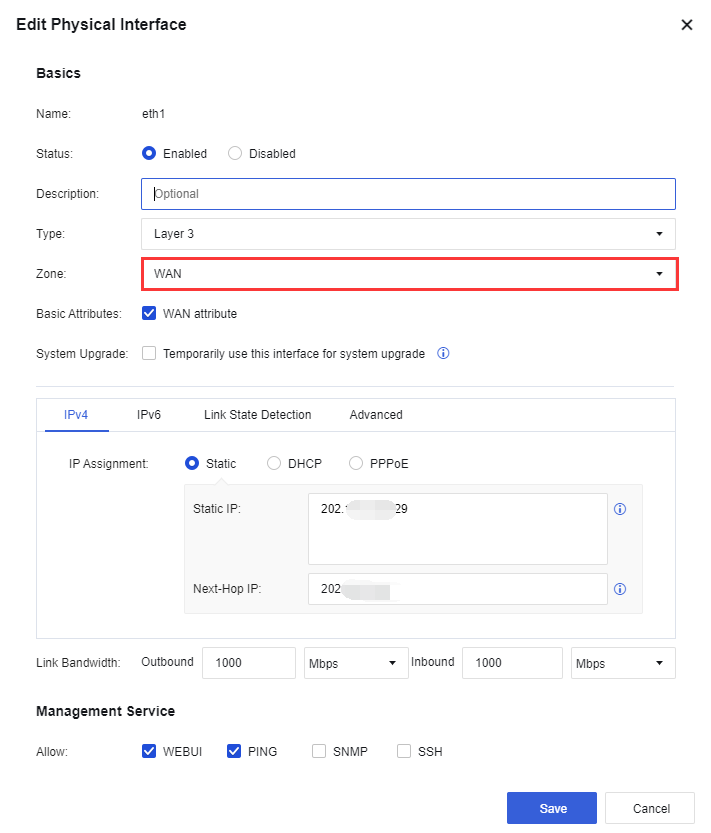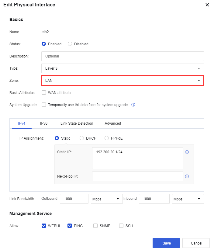 Step 1. First, ensure that two zones (internal and external) have been created. In this scenario, LAN (eth2) and WAN (eth1) zones were established.