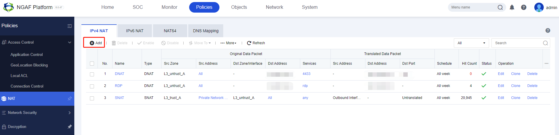 Step 2. Navigate to the NGAF Policies > NAT > IPv4 NAT module and click Add to create a new NAT policy.