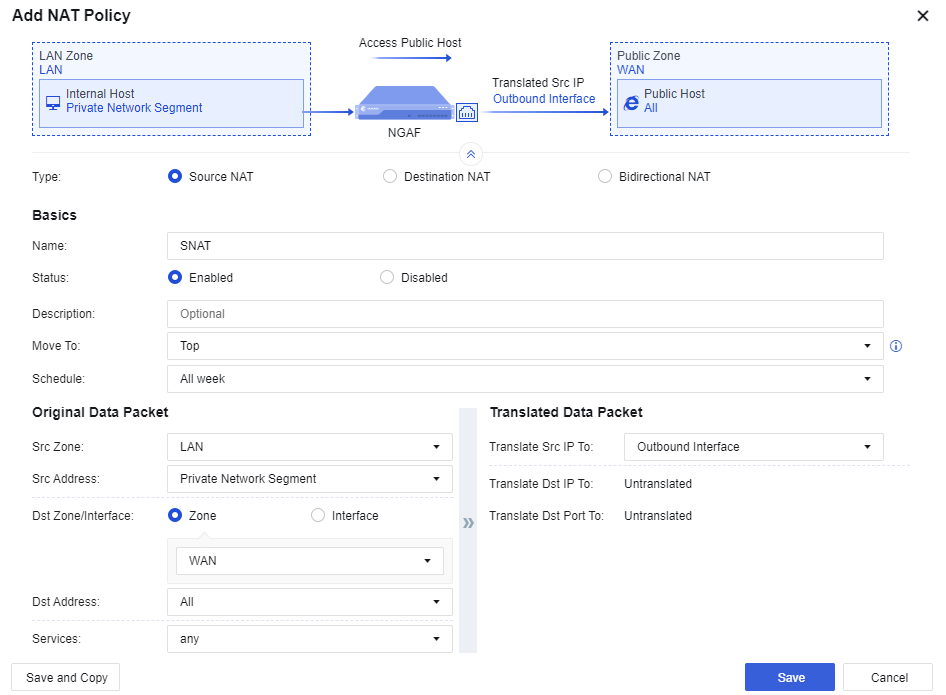 Src Zone: LAN zone(Zone where users require access to the Internet).