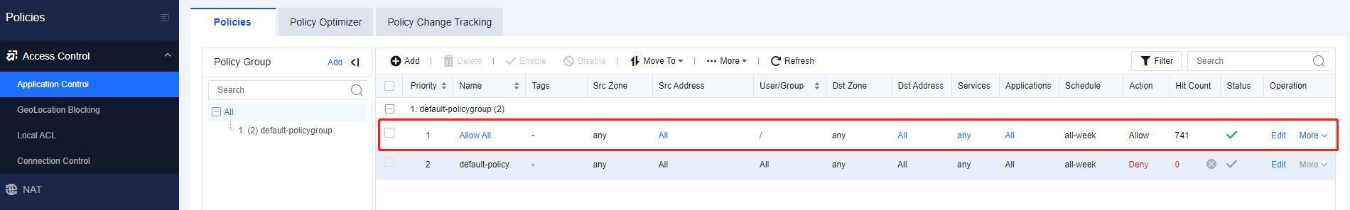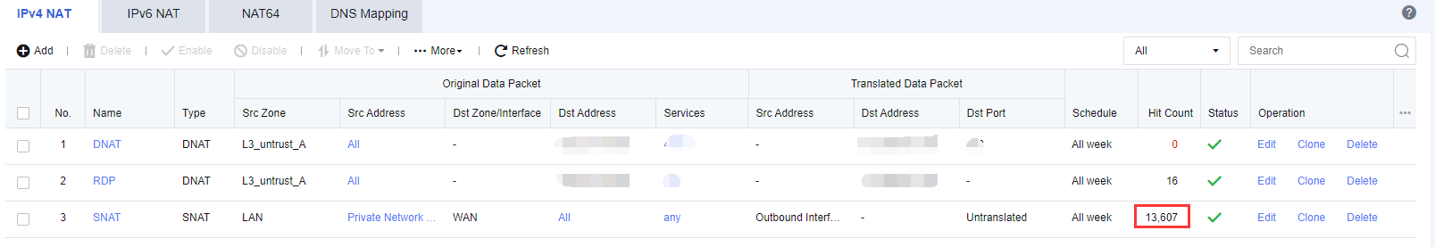 Step 2. A hit count will be recorded when traffic passes through the policy, indicating that the NAT policy is functioning.