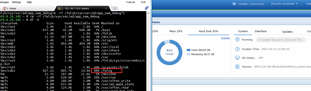 - Check df -h, found that /fwlog partition is used up to 98%