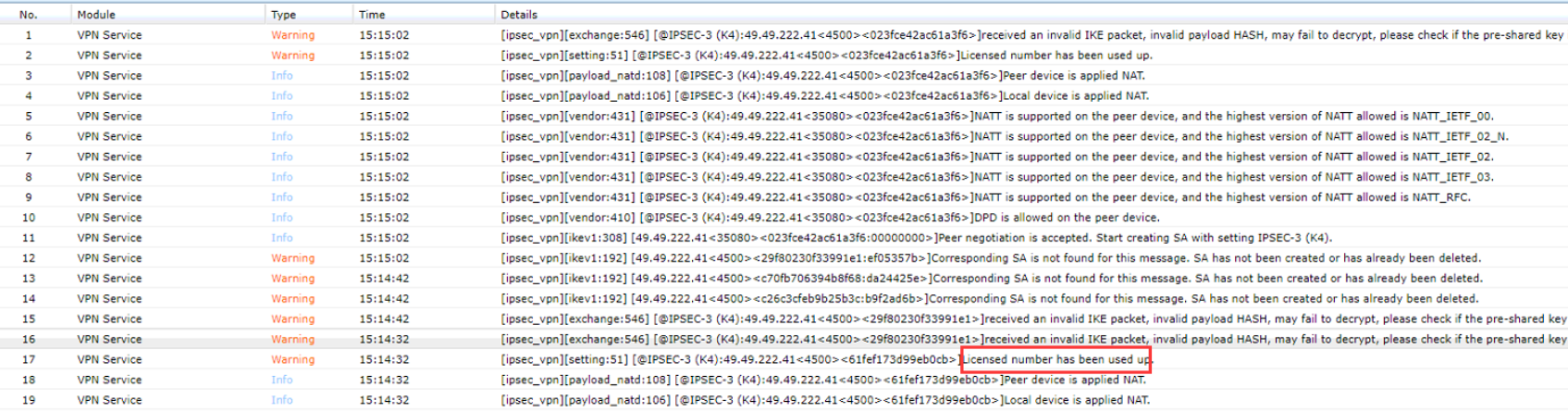 Customer feedback that IPSEC VPN unable to build, check on the system log have "License Number has been used up" log.