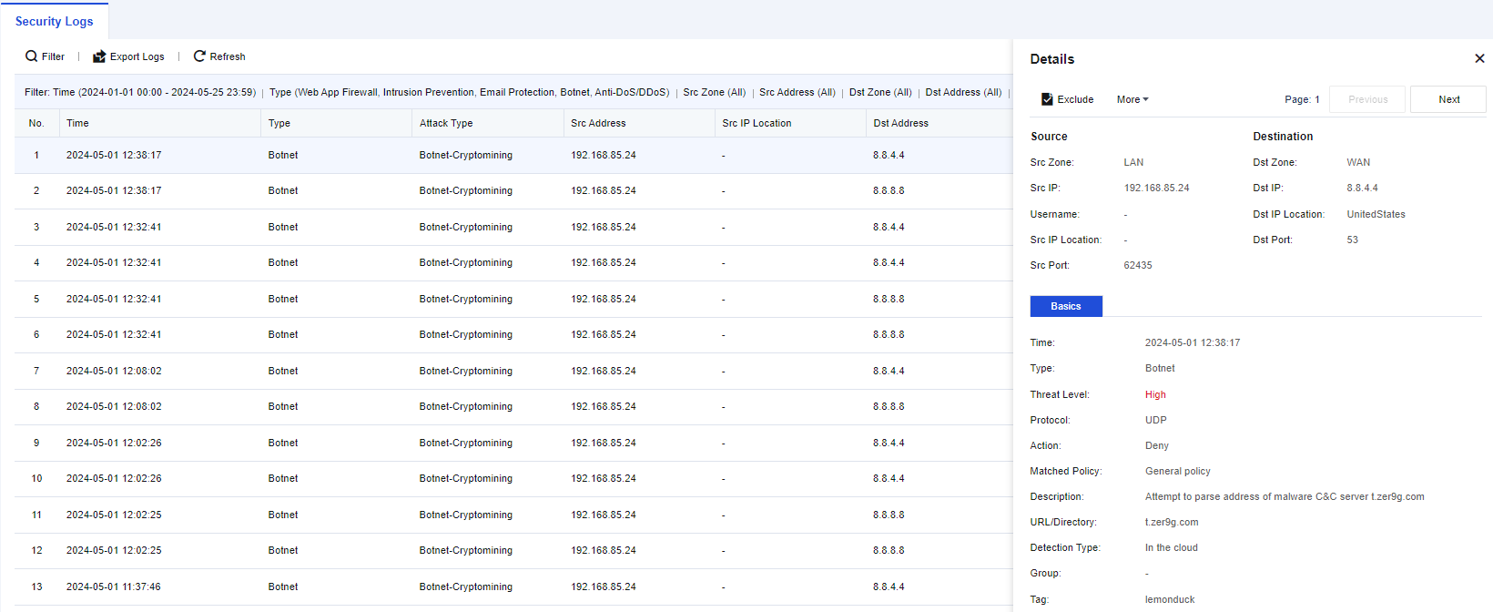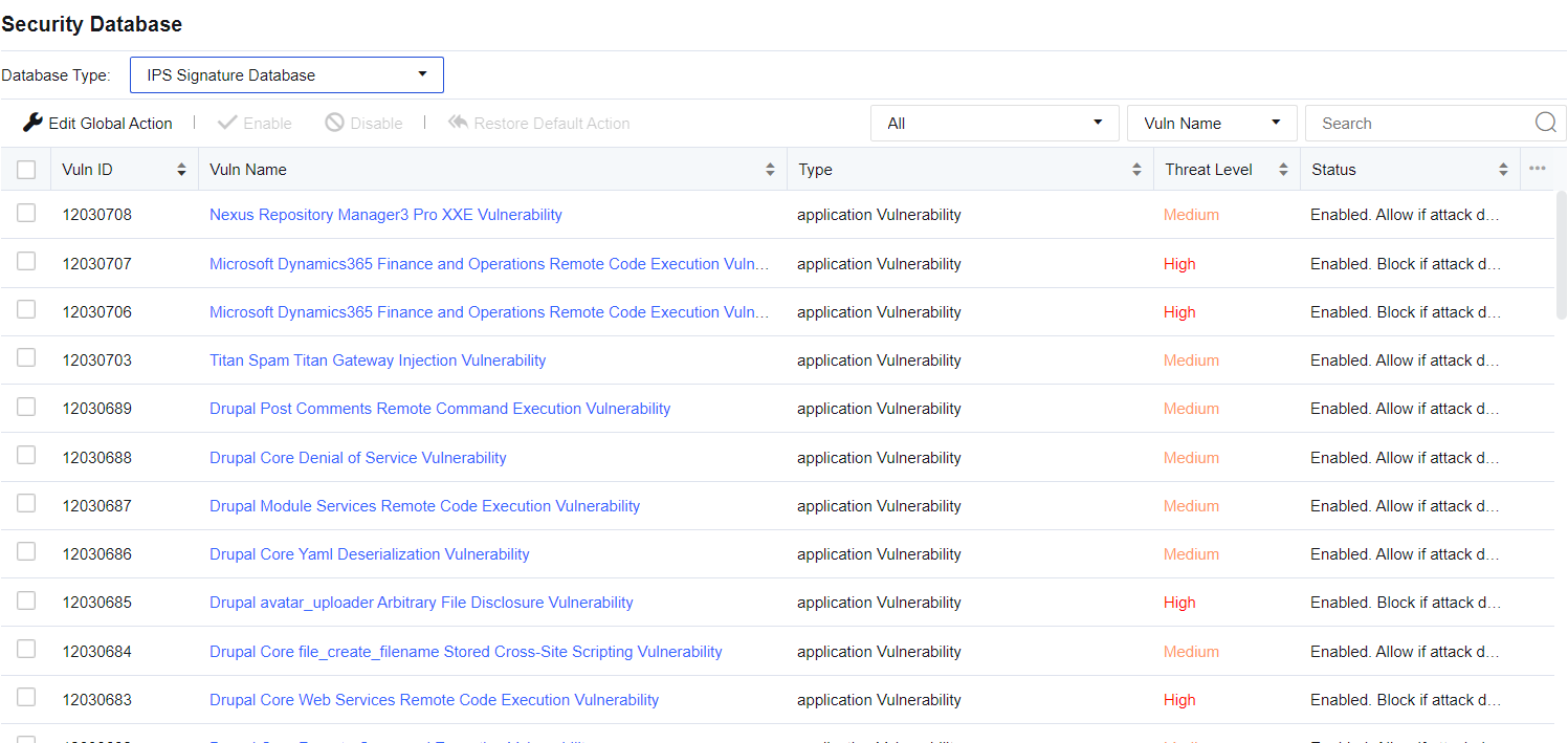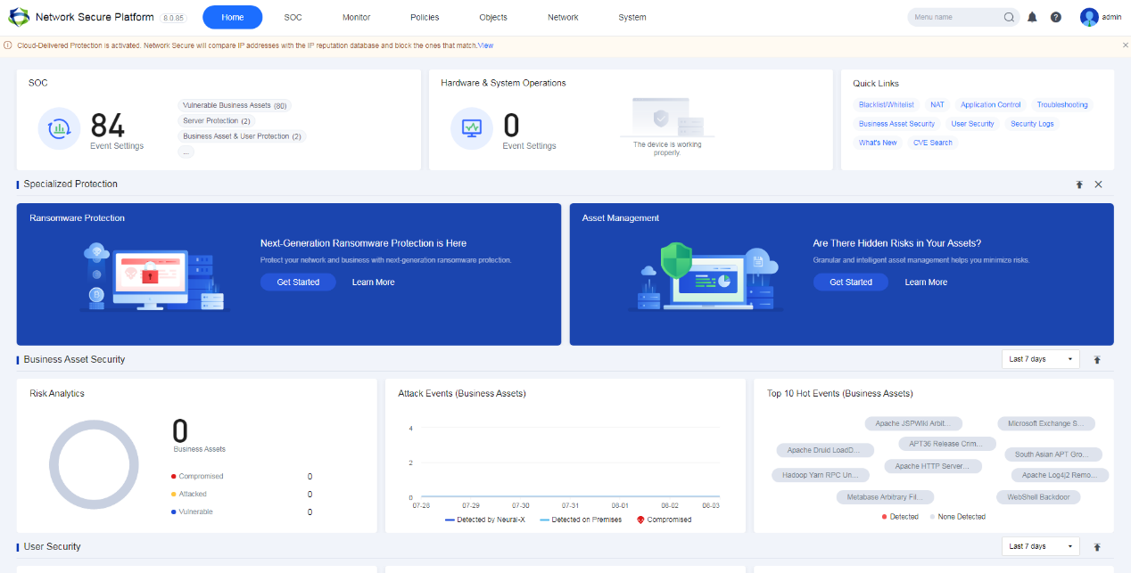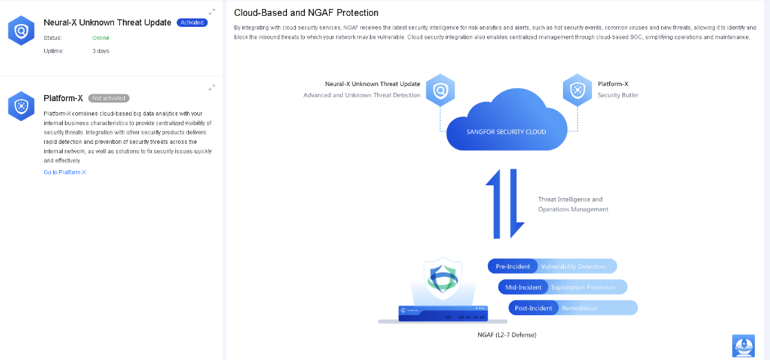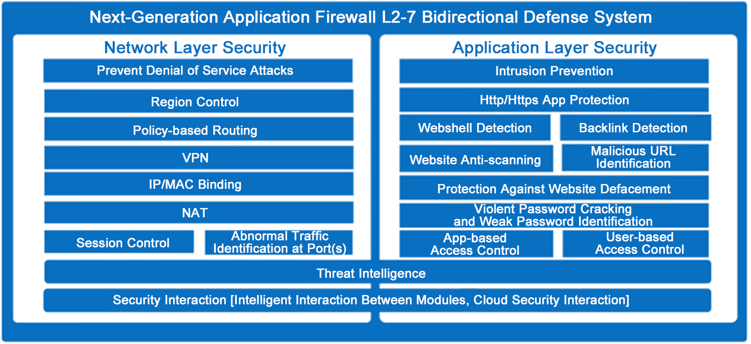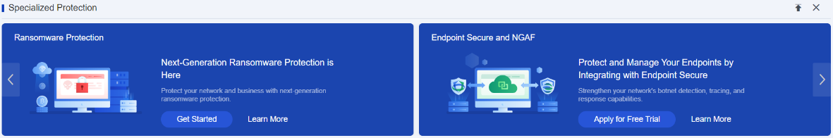 Network Secure integrates several security technologies for effective defense during an event. It provides a complete security defense system (L2-L7) to ensure no weaknesses in security protection. At the same time, Network Secure can also improve the timeliness and effectiveness of the defense system through security integration, including integrating cloud and endpoint security solutions and coordinating different modules. In addition, Network Secure also cooperates with third-party security agencies and utilizes threat intelligence from multiple sources, such as the Chinese National Vulnerability Database, VirusTotal, and malicious URL databases, to help users prepare for defense before security events occur.