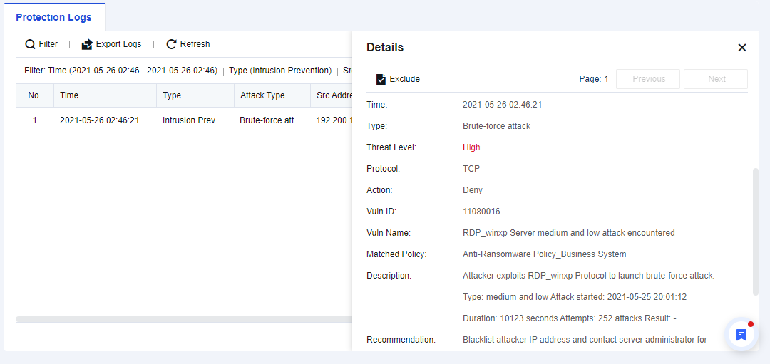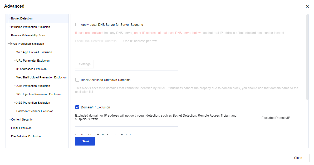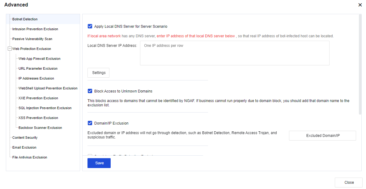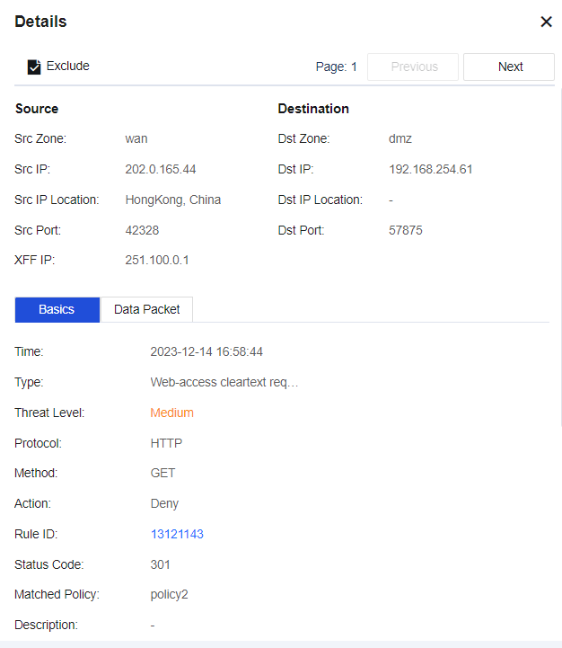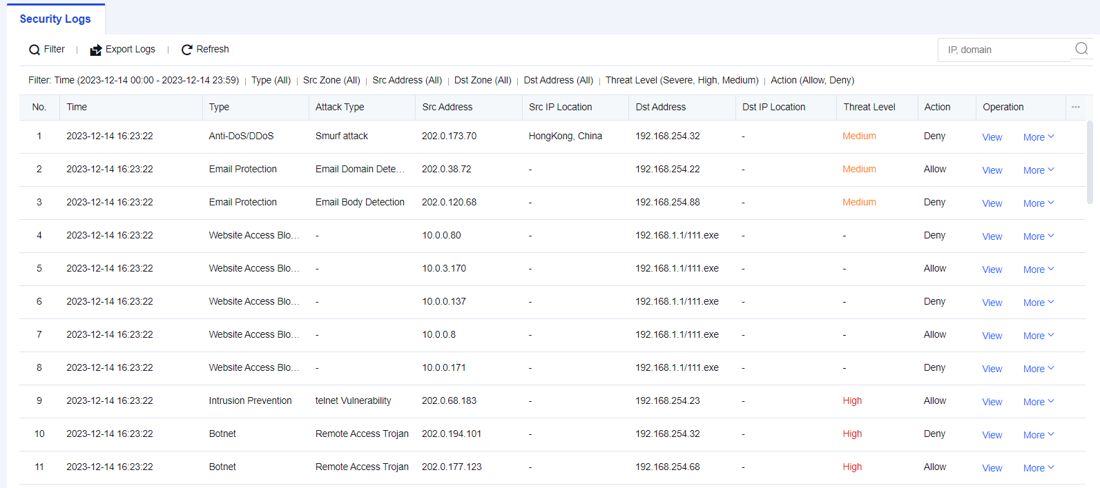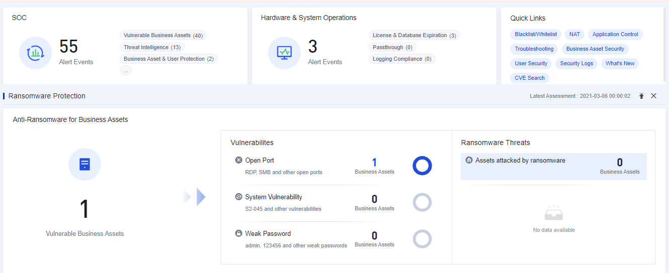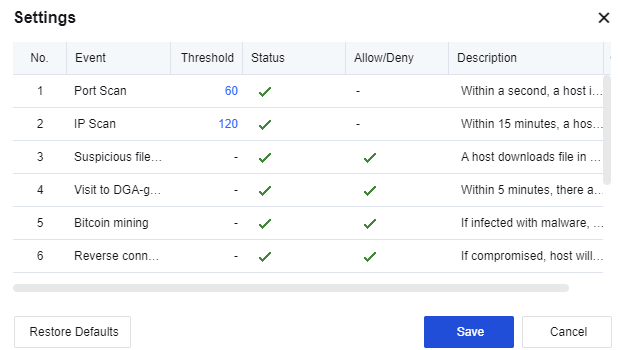 Network Secure integrates several security technologies for effective defense during an event. It provides a complete security defense system (L2-L7) to ensure no weaknesses in security protection. At the same time, Network Secure can also improve the timeliness and effectiveness of the defense system through security integration, including integrating cloud and endpoint security solutions and coordinating different modules. In addition, Network Secure also cooperates with third-party security agencies and utilizes threat intelligence from multiple sources, such as the Chinese National Vulnerability Database, VirusTotal, and malicious URL databases, to help users prepare for defense before security events occur.