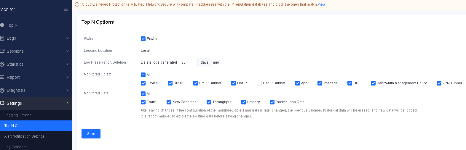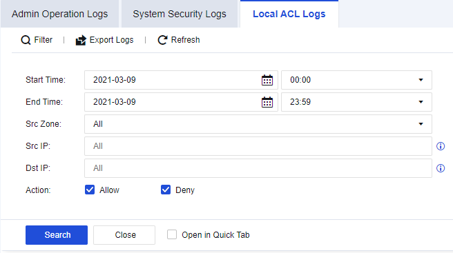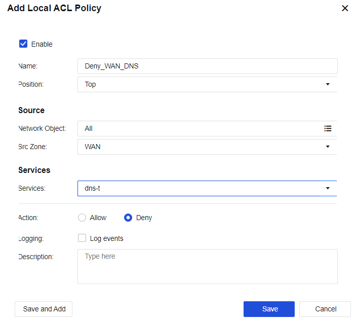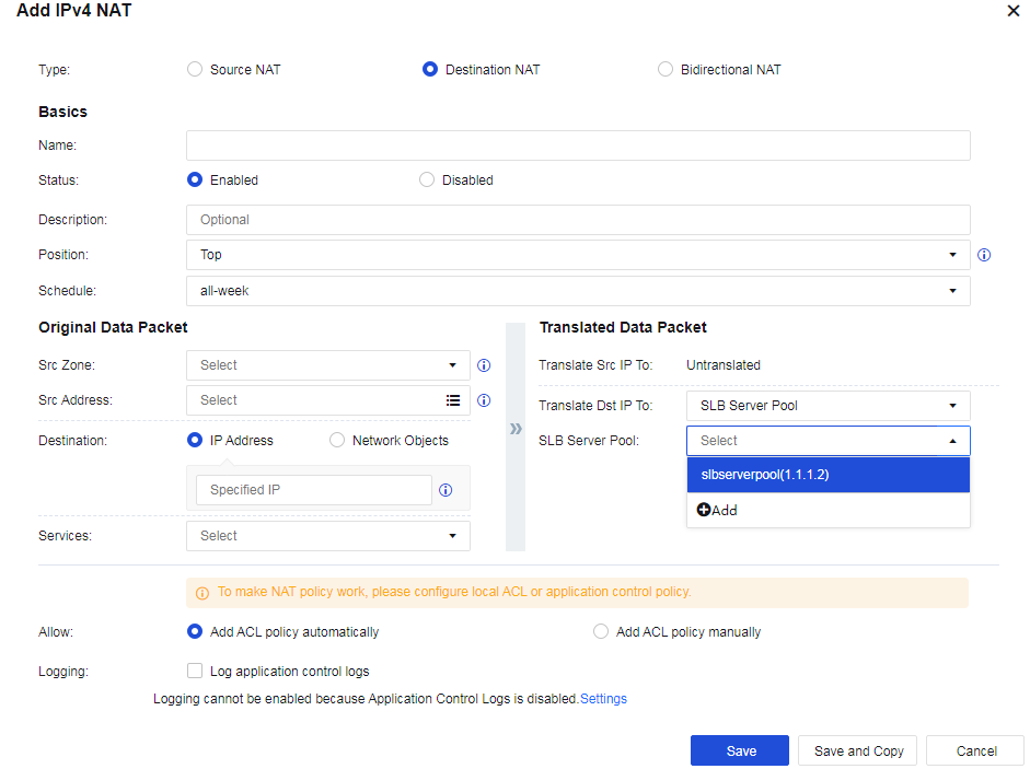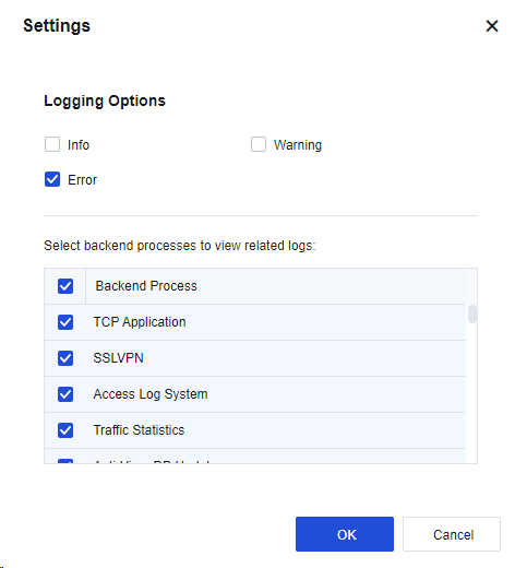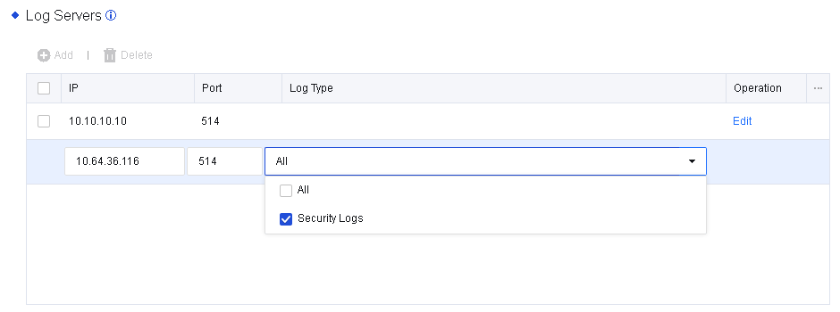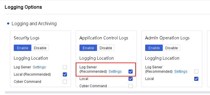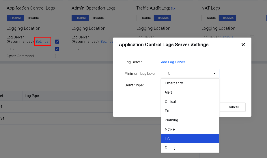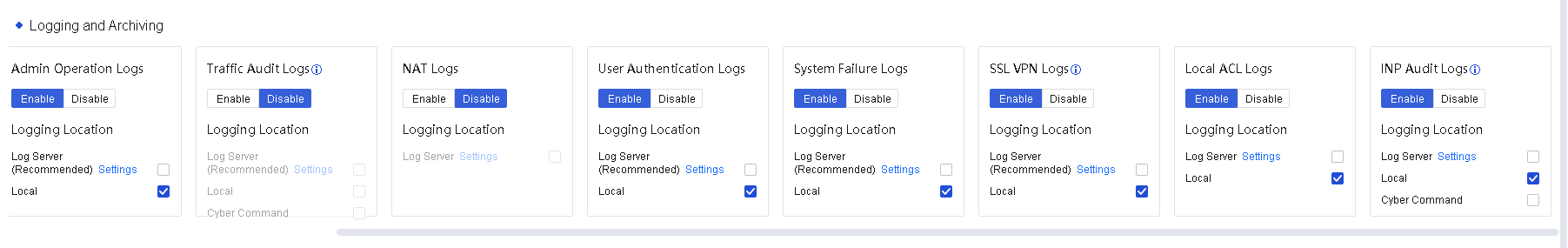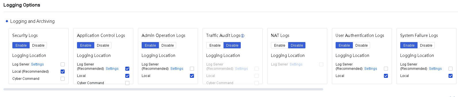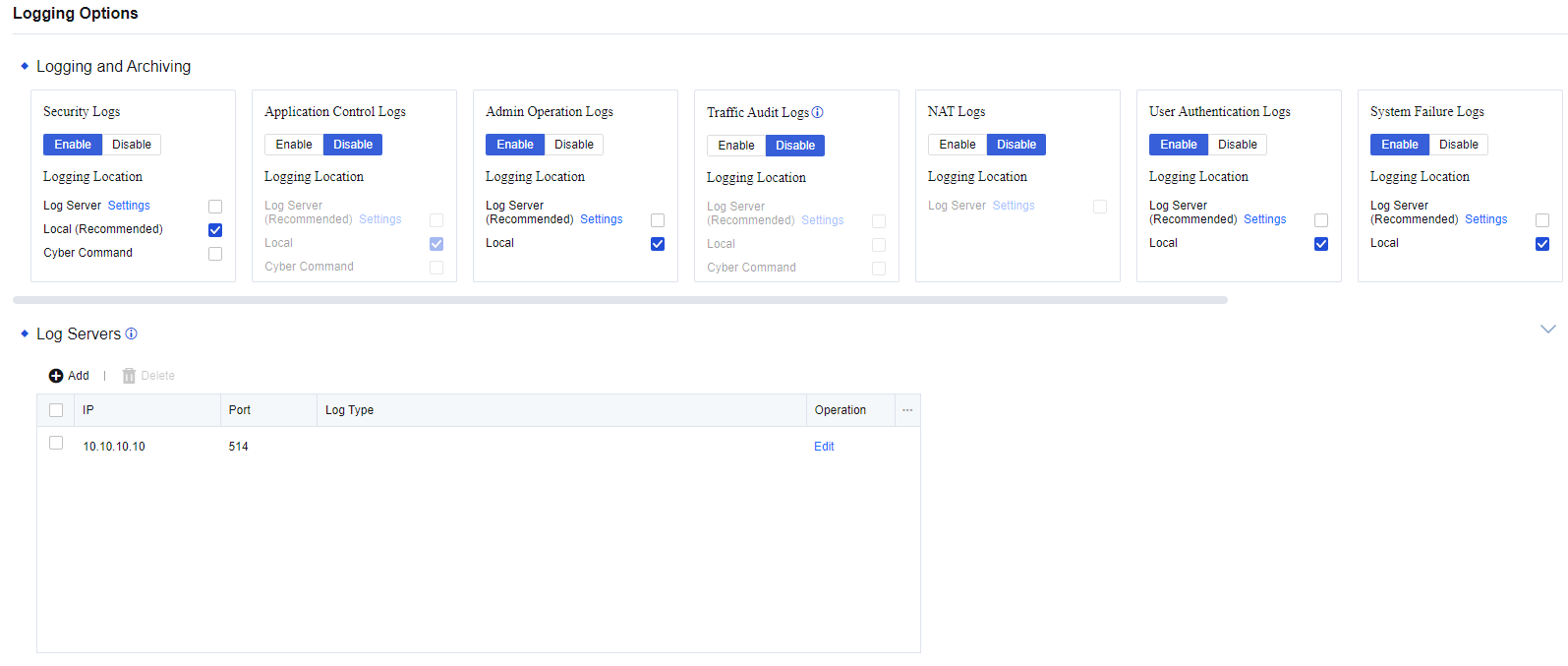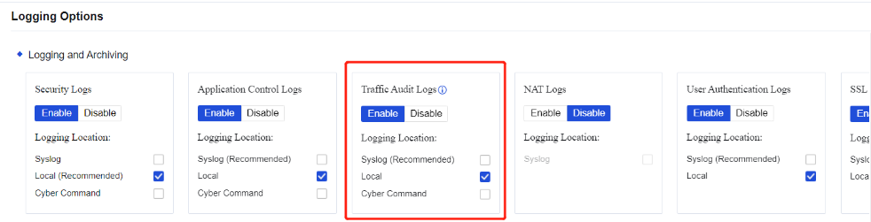 The Traffic Audit Logs is as shown below (Disable it normally). If you need to enable it, select the Syslog (Recommended) or Cyber Command for the logging location. It is not recommended to record logs in the firewall.