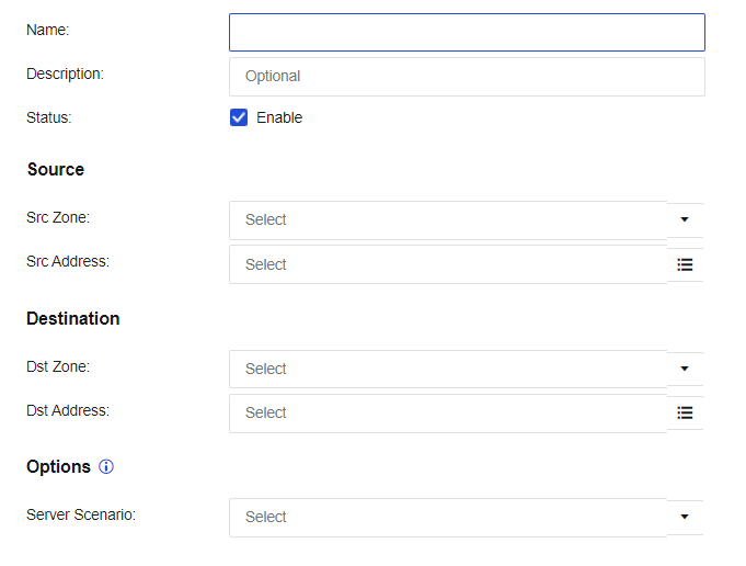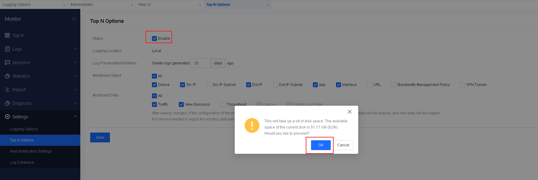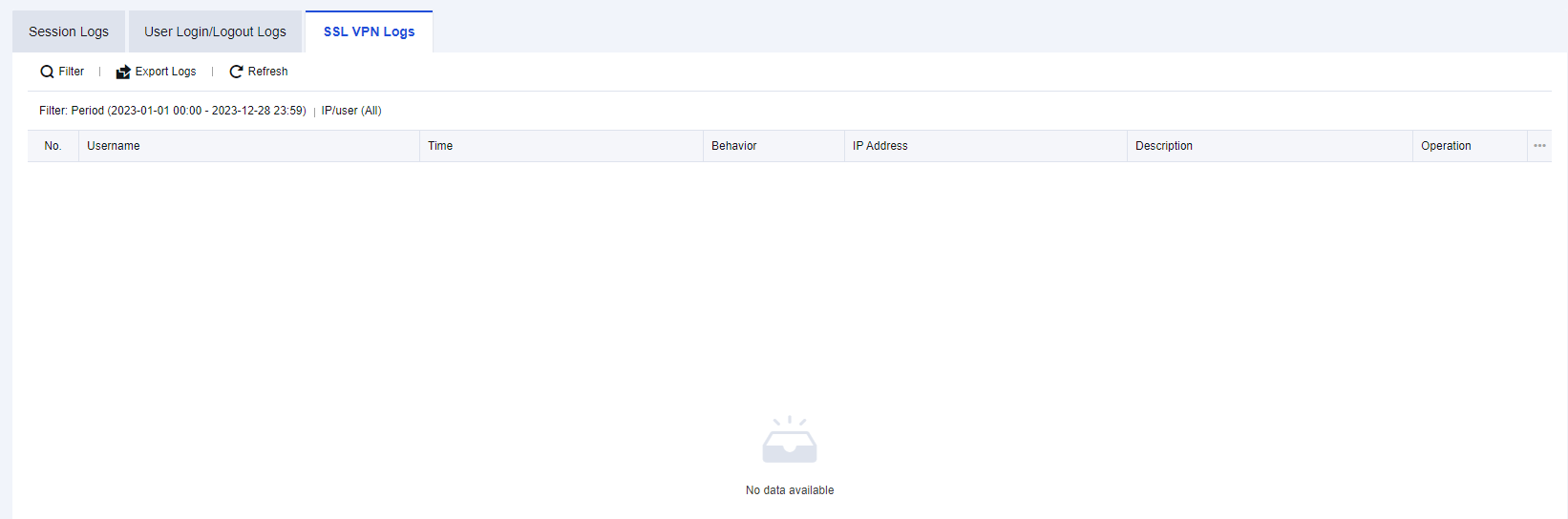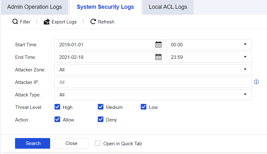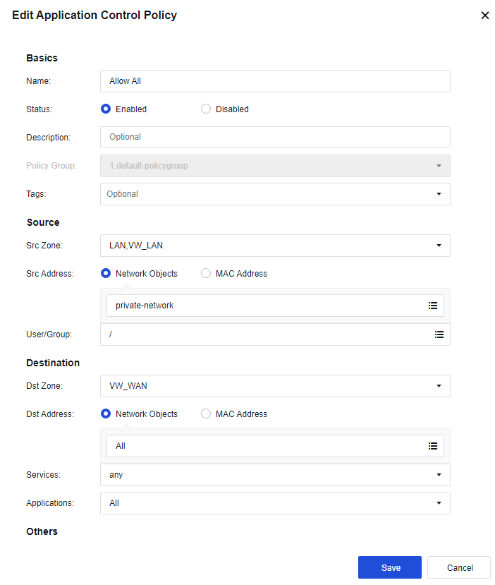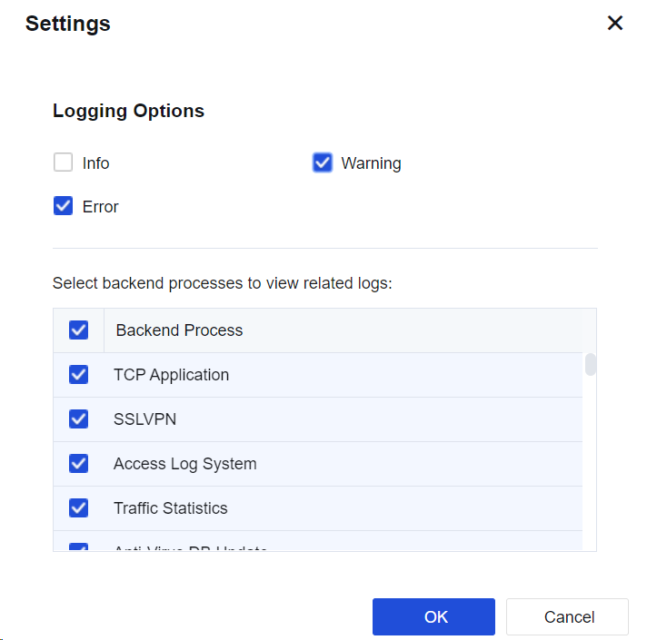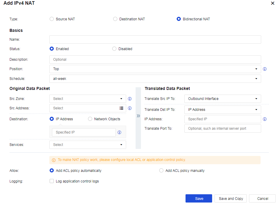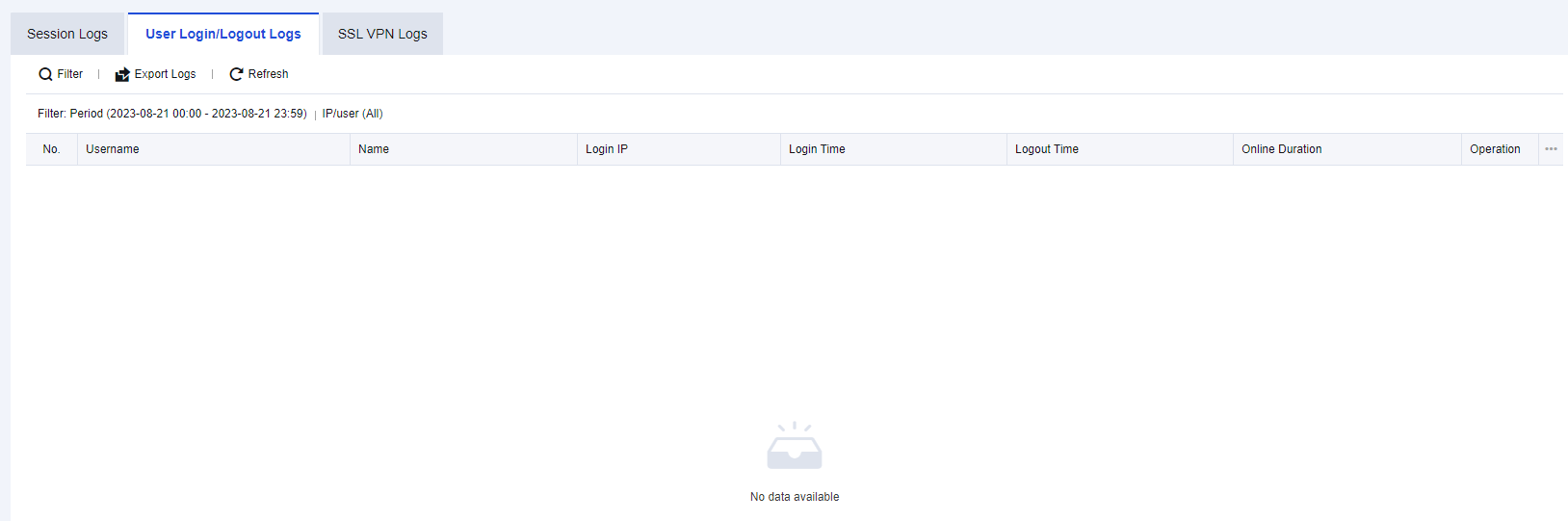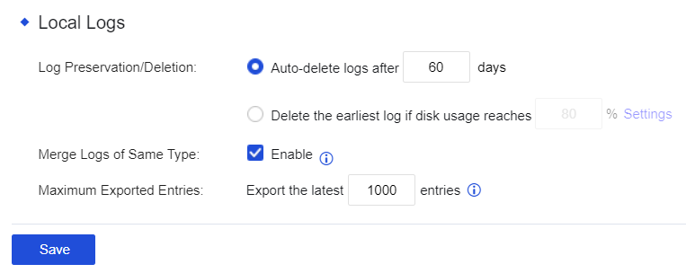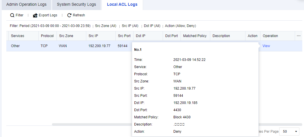 The Traffic Audit Logs is as shown below (Disable it normally). If you need to enable it, select the Syslog (Recommended) or Cyber Command for the logging location. It is not recommended to record logs in the firewall.