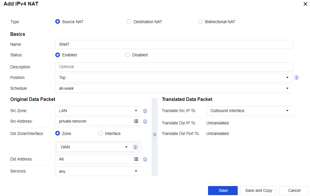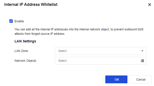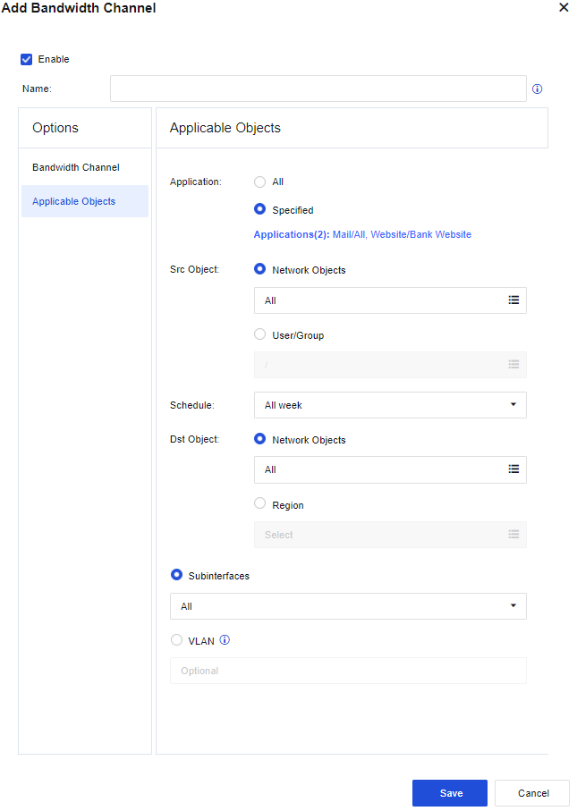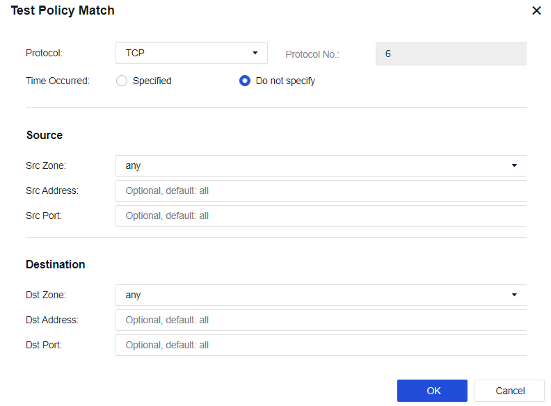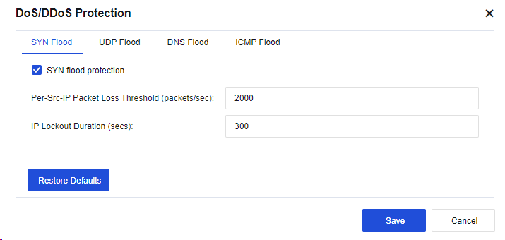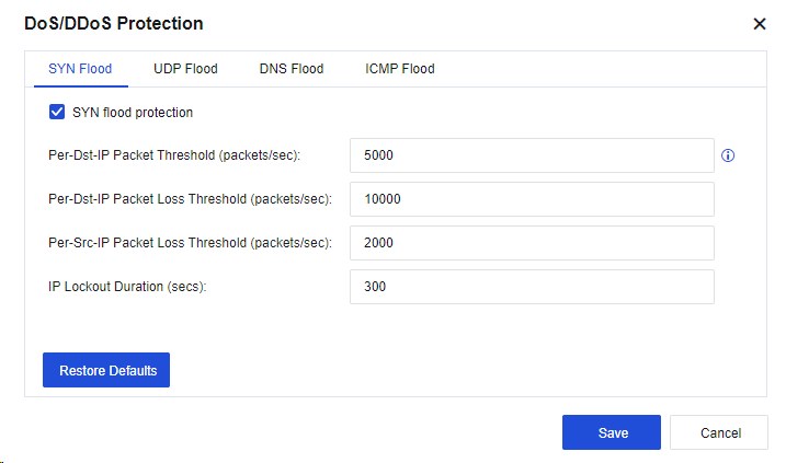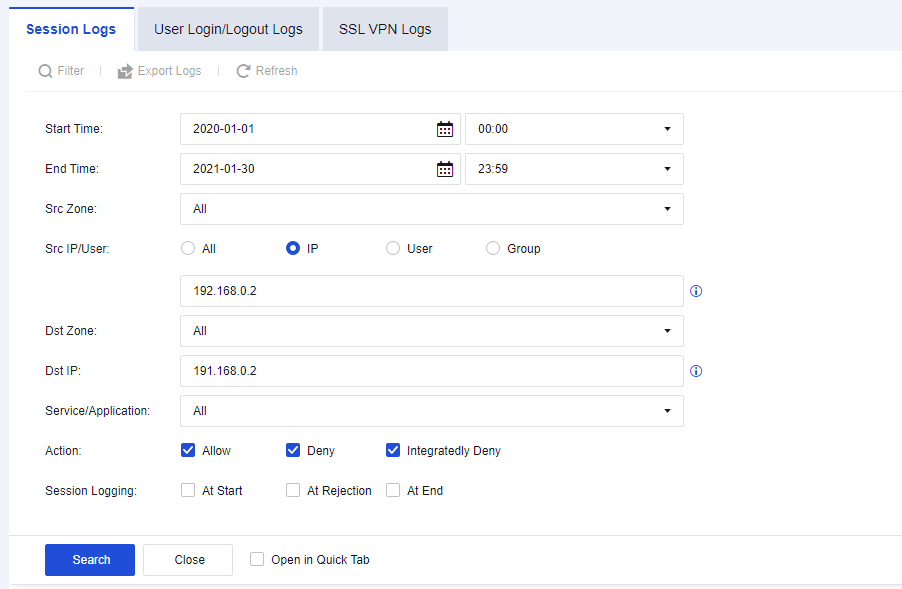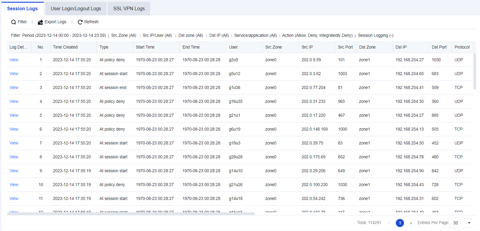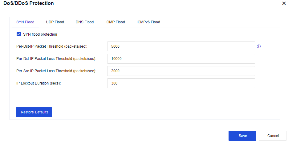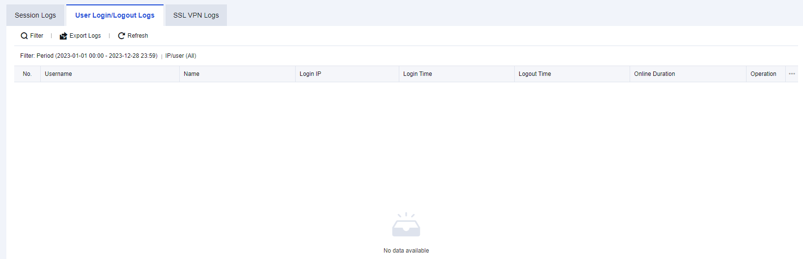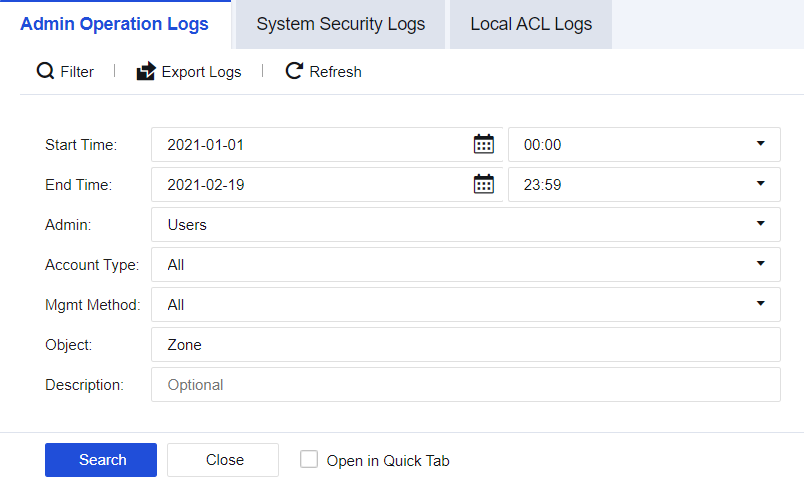 The Traffic Audit Logs is as shown below (Disable it normally). If you need to enable it, select the Syslog (Recommended) or Cyber Command for the logging location. It is not recommended to record logs in the firewall.