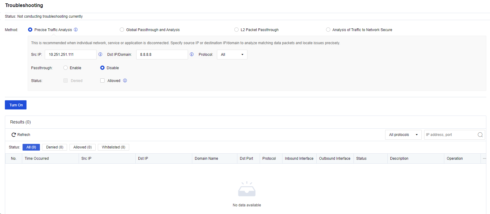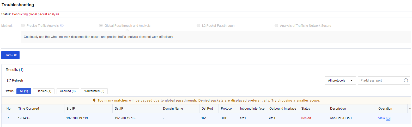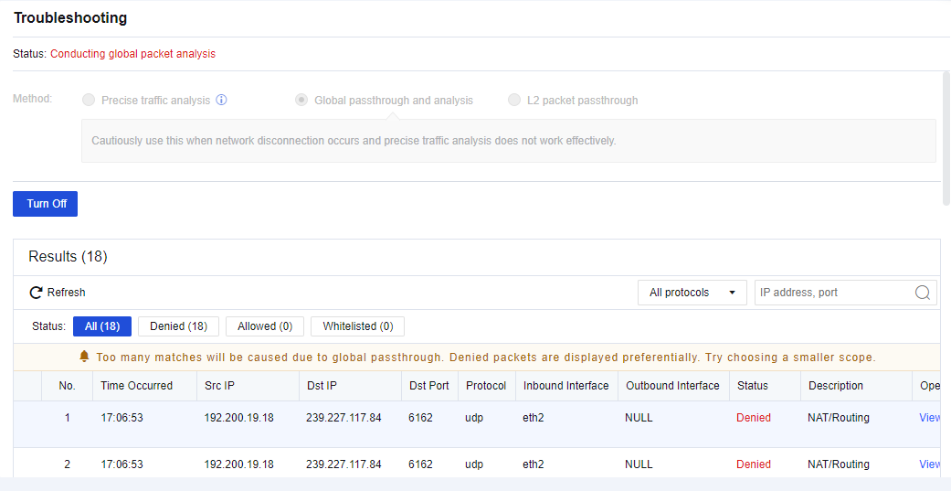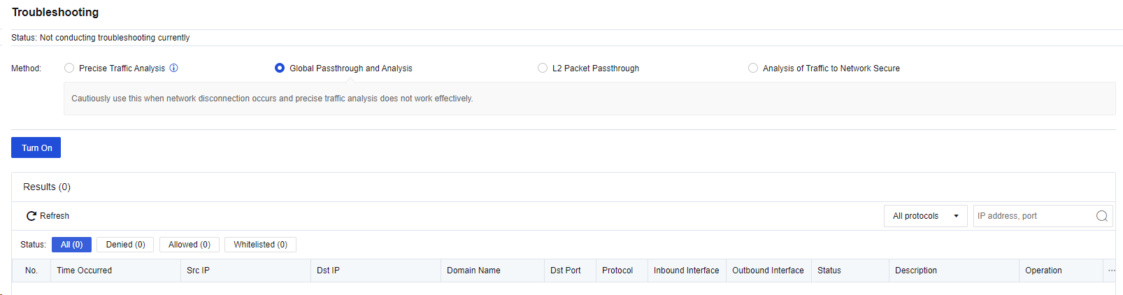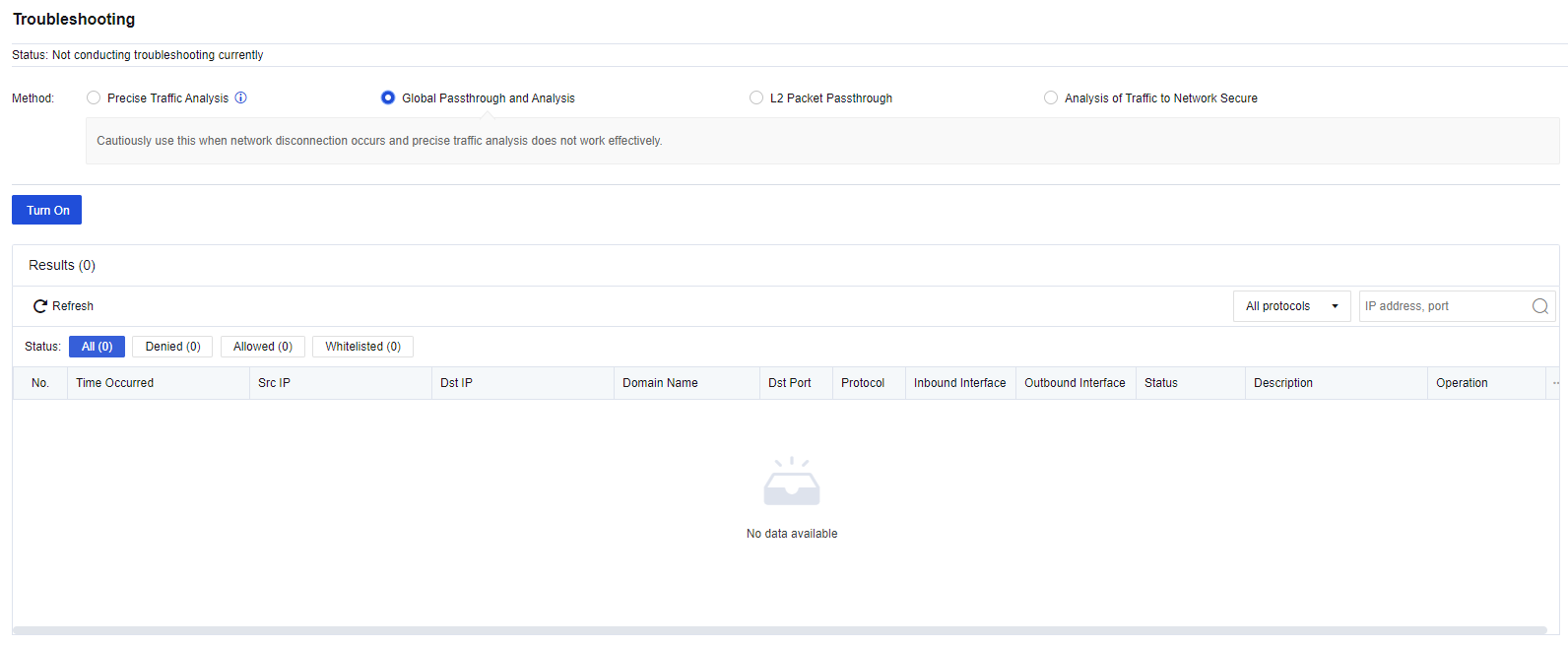 Enable Global Passthrough and Analysis to check whether the user can access the Internet. If so, view the interception logs to find out modules denying inbound and outbound packets, and modify the policy. Disable Global Passthrough and Analysis to test whether the Internet access returns to normal. If not, enable Global Passthrough and Analysis again and modify the policy according to the interception logs until failures are repaired.