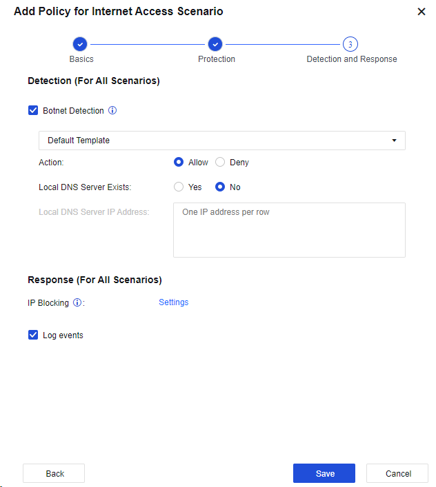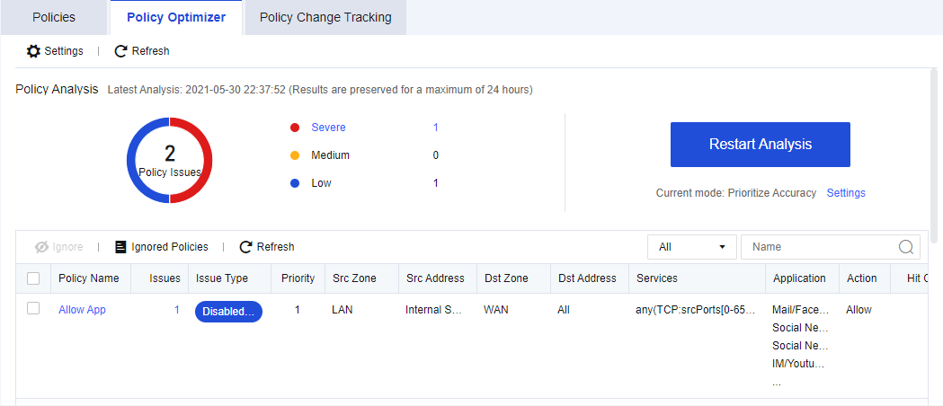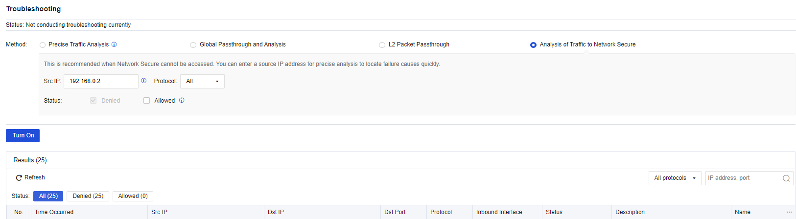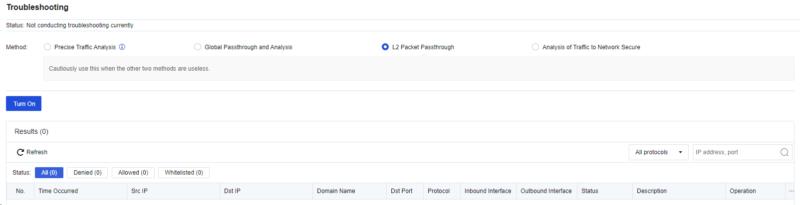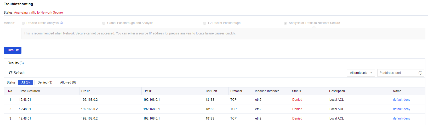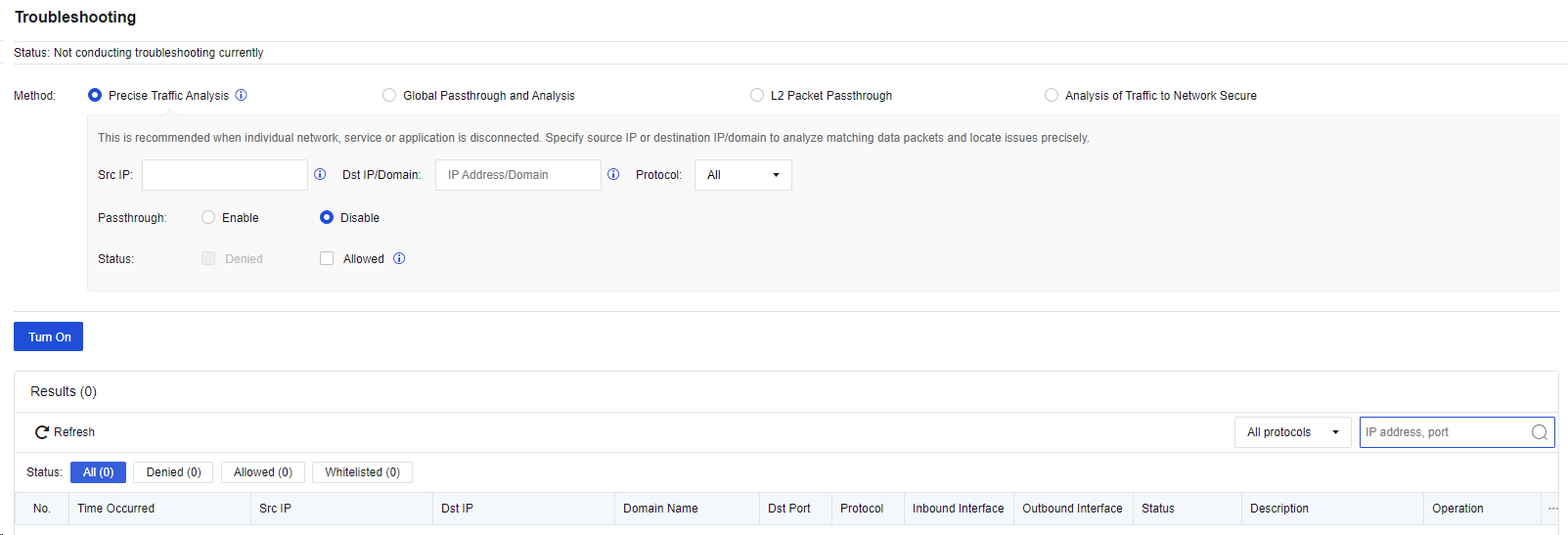 Enable Global Passthrough and Analysis to check whether the user can access the Internet. If so, view the interception logs to find out modules denying inbound and outbound packets, and modify the policy. Disable Global Passthrough and Analysis to test whether the Internet access returns to normal. If not, enable Global Passthrough and Analysis again and modify the policy according to the interception logs until failures are repaired.