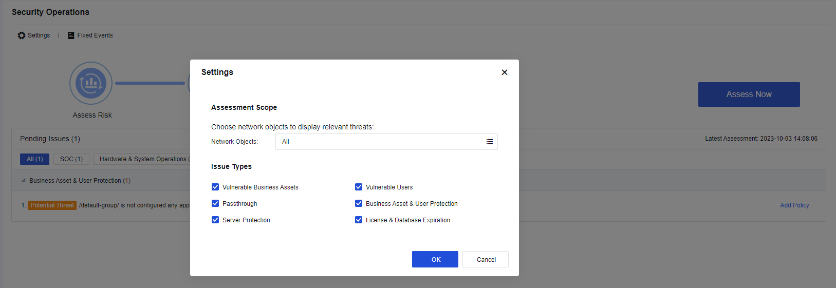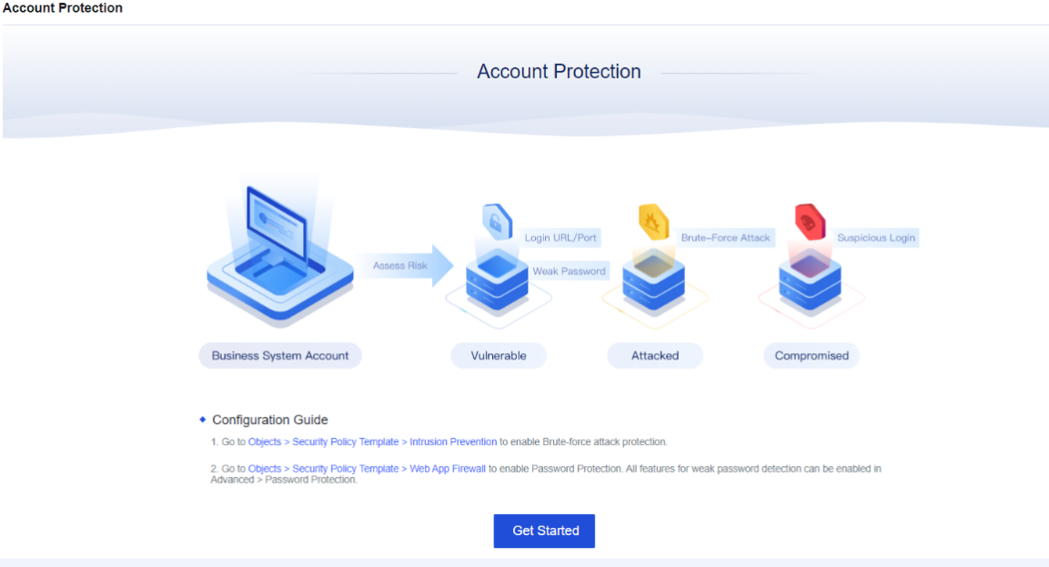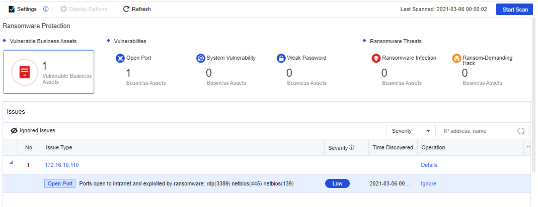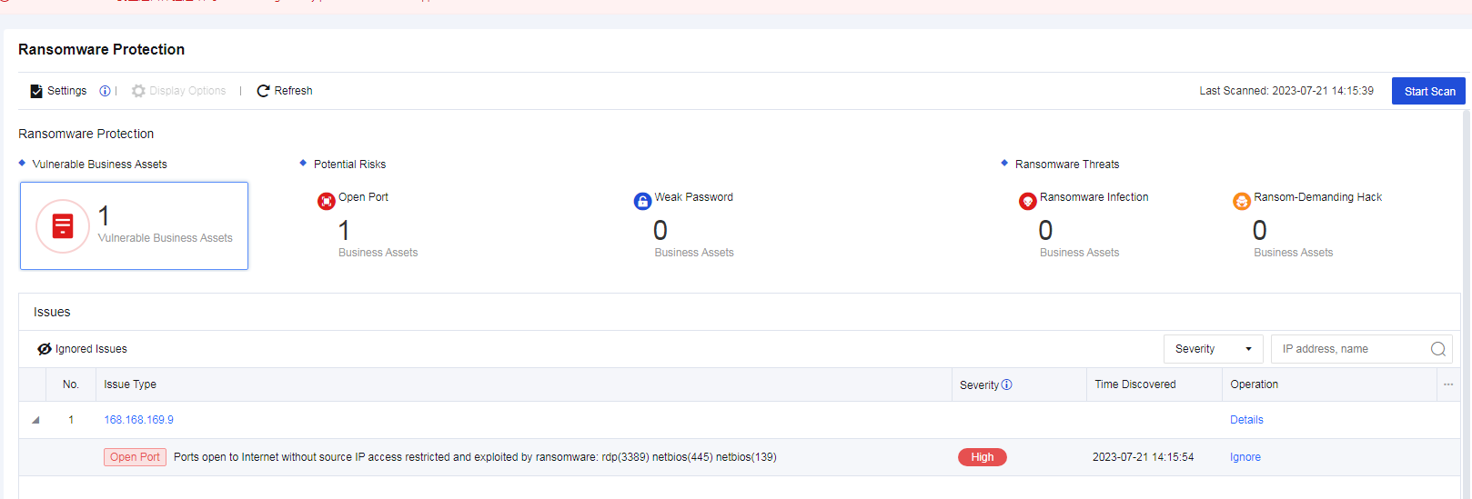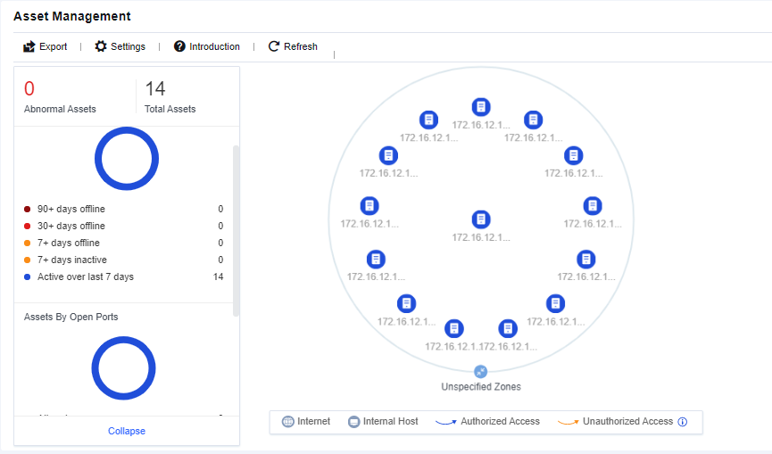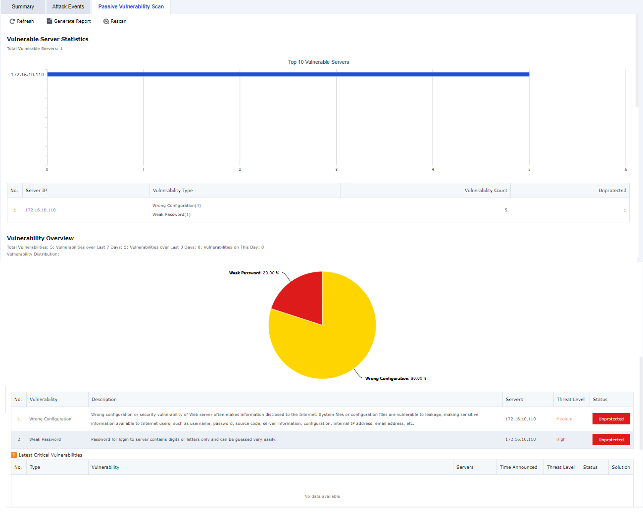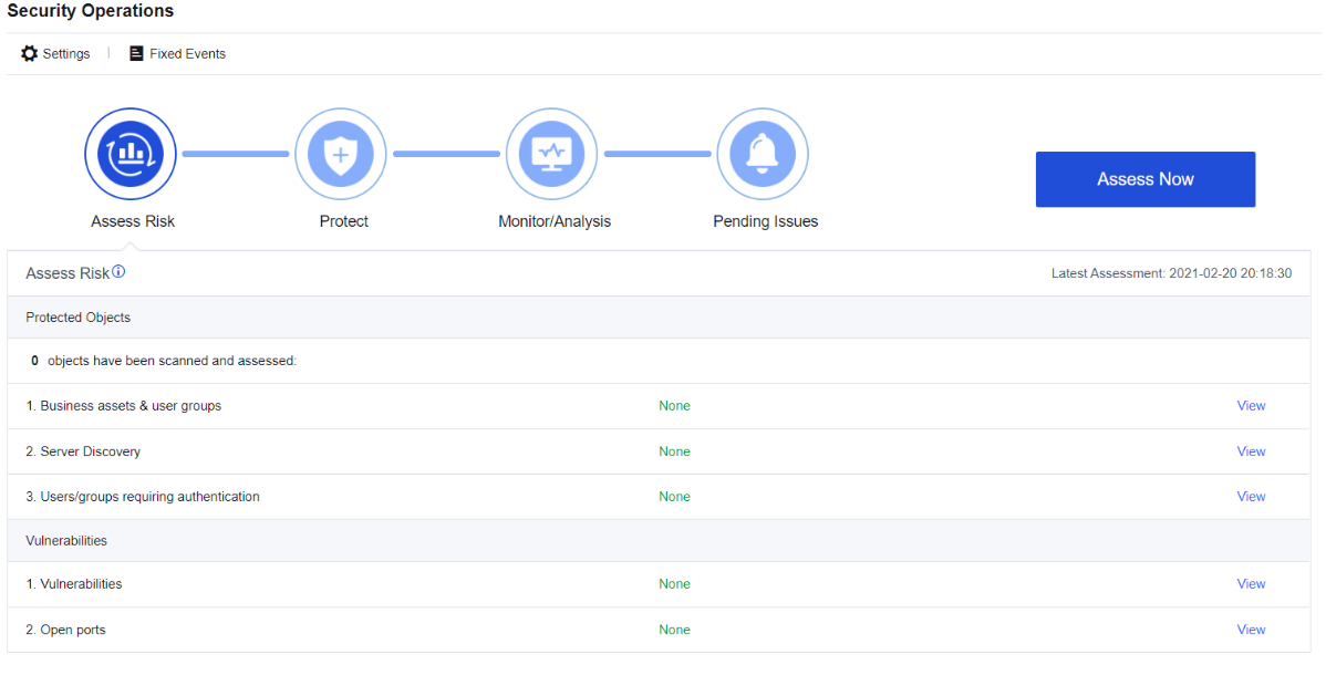 Network Secure can automatically identify risks such as open ports, vulnerabilities, and weak passwords on internal servers in advance and judge whether the identified assets have corresponding security protection policies and are in effect.